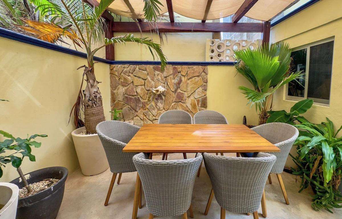 Múltiples áreas de entretenimiento al aire libre, perfectas para relajarse, comer o disfrutar del ambiente tropical.