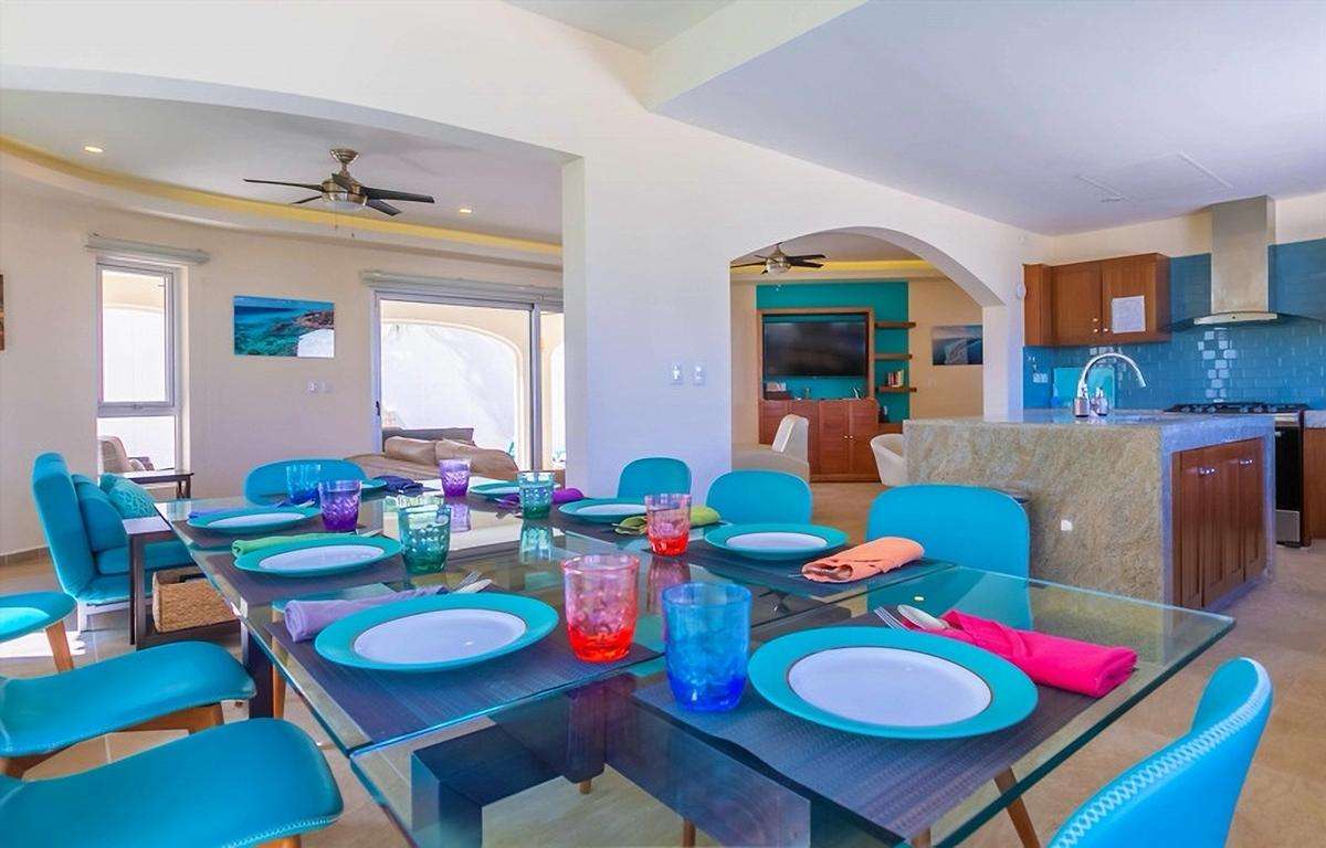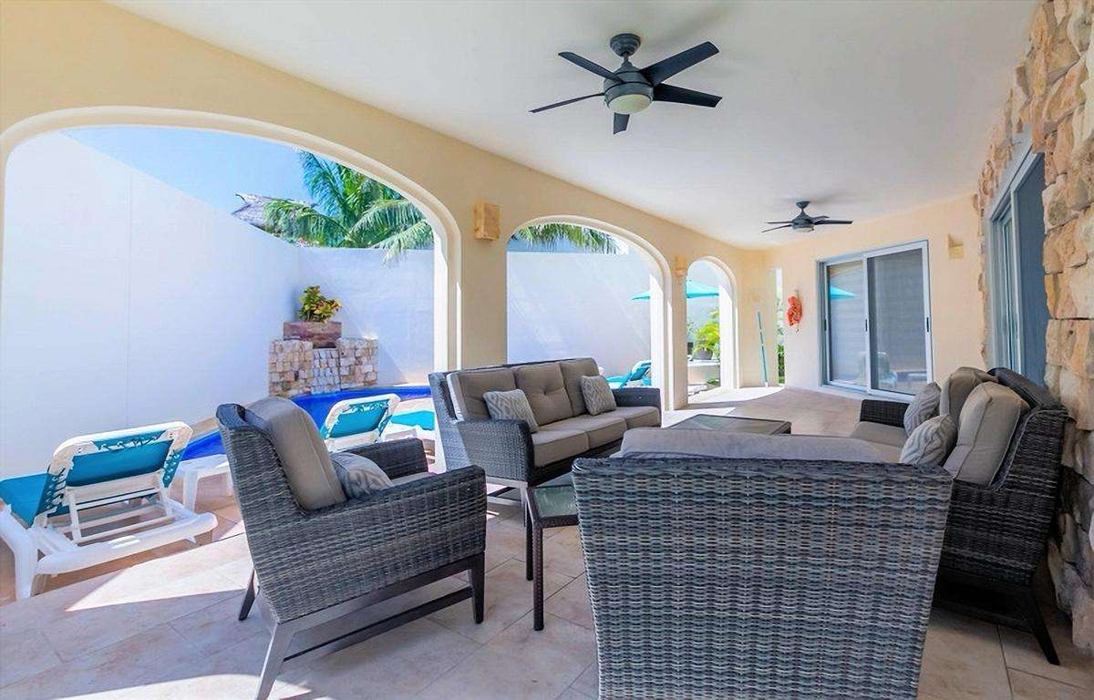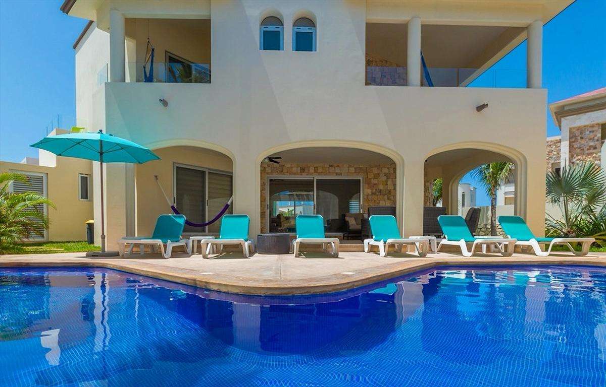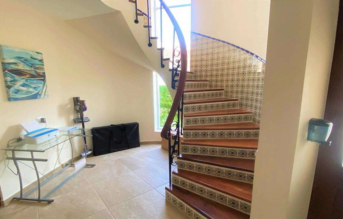 La planta baja está diseñada con una distribución abierta que incorpora un comedor, una cocina bien diseñada con una gran isla de granito, una magnífica sala de estar y acceso a la terraza de la piscina a través de unas puertas de patio de gran tamaño. Una gran piscina climatizada con cascada y una amplia terraza ofrecen mucho espacio para relajarse y divertirse. Además, en la planta baja se encuentra la primera suite king, decorada con buen gusto con una temática acuática y un baño de mármol. Bajo una gran escalera de caracol revestida con azulejos mexicanos de colores vivos se encuentra una zona de oficina para aprovechar la conexión a Internet de fibra óptica de alta velocidad.