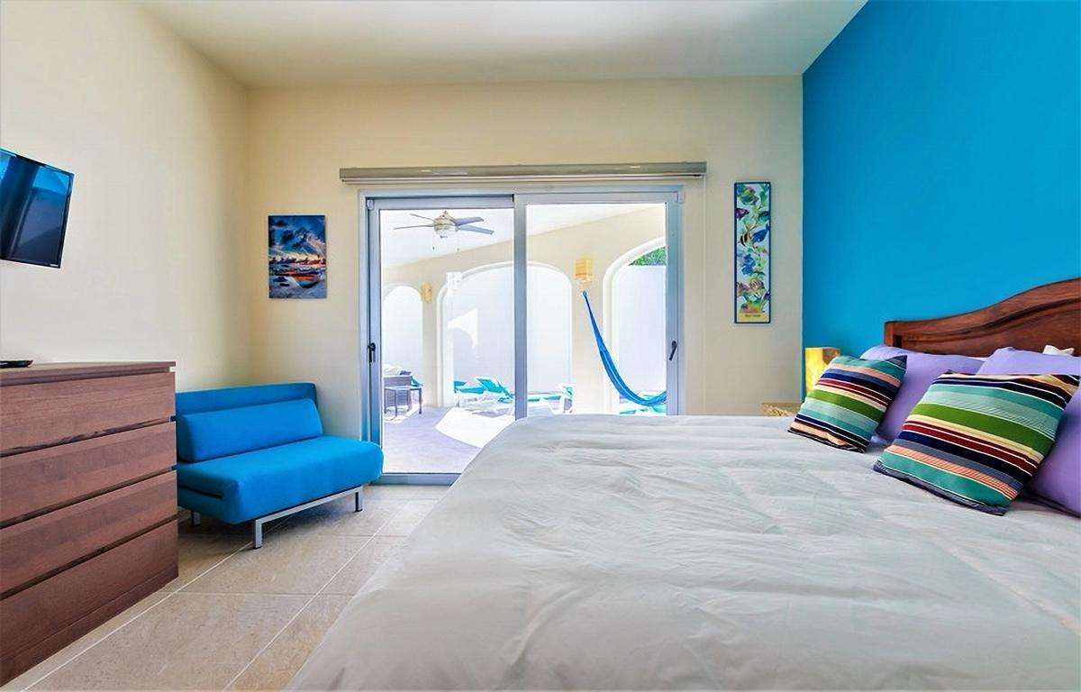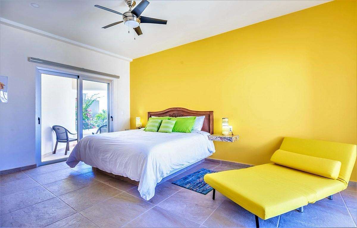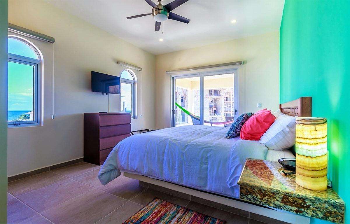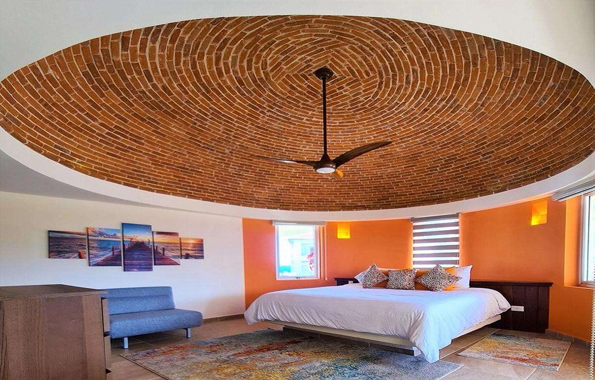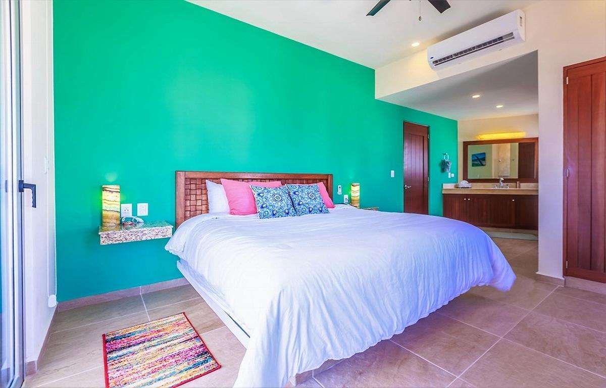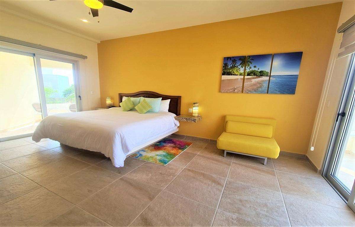El segundo nivel cuenta con tres suites king adicionales, cada una con su propia personalidad y decoración en colores. Todas tienen baños privados de mármol y amplias terrazas con vista al mar. La suite principal tiene un impresionante techo abovedado de estilo español.