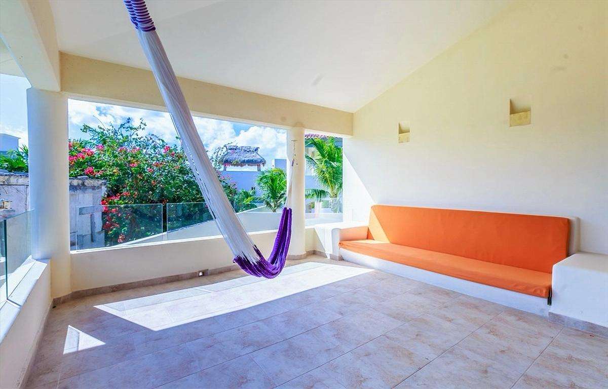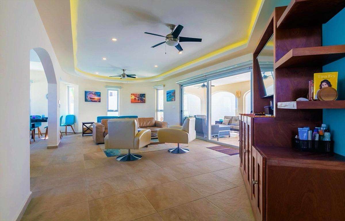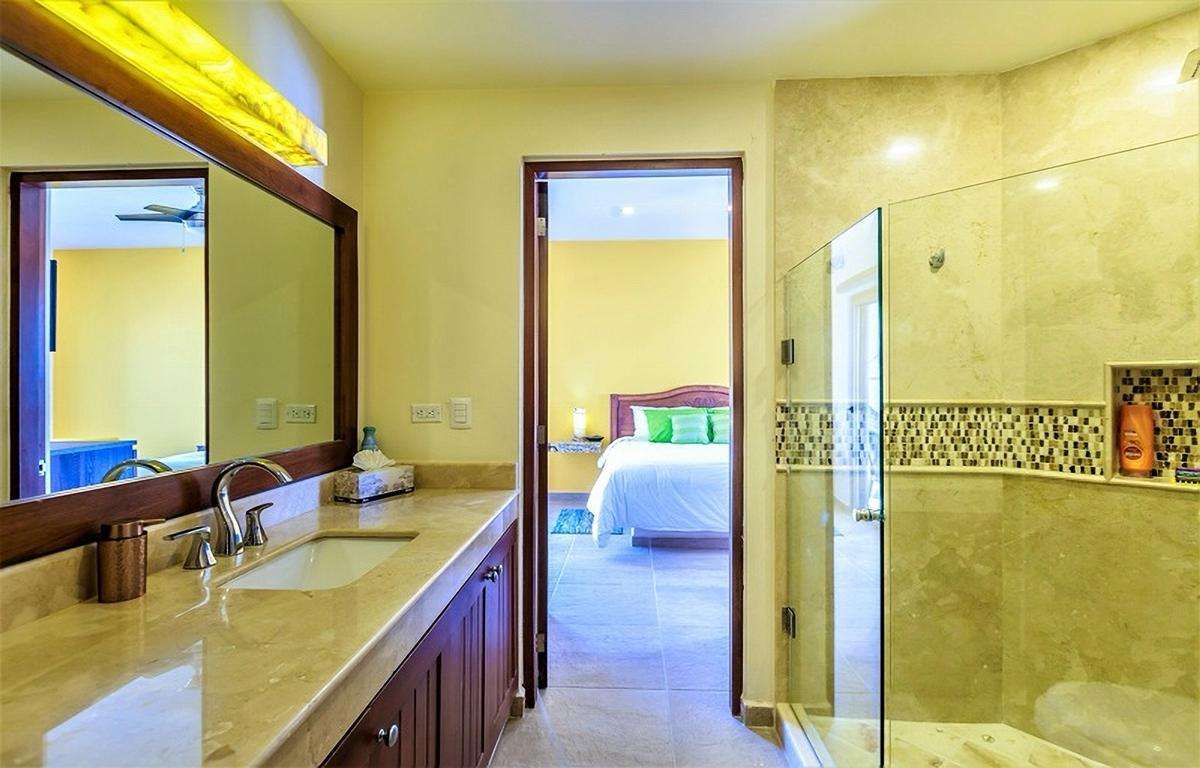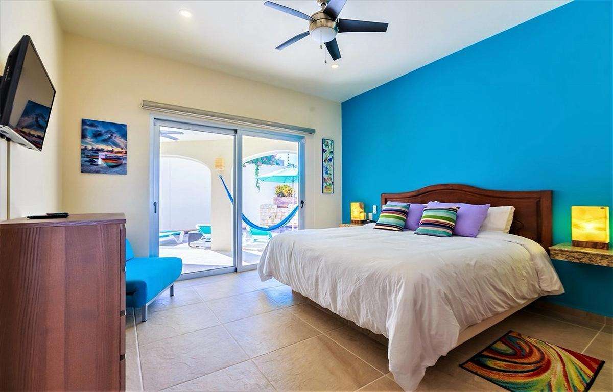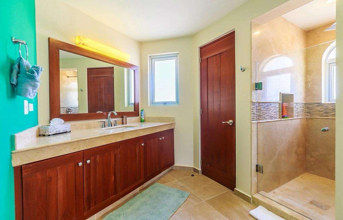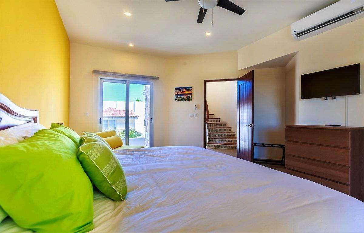 El segundo nivel cuenta con tres suites king adicionales, cada una con su propia personalidad y decoración en colores. Todas tienen baños privados de mármol y amplias terrazas con vista al mar. La suite principal tiene un impresionante techo abovedado de estilo español.