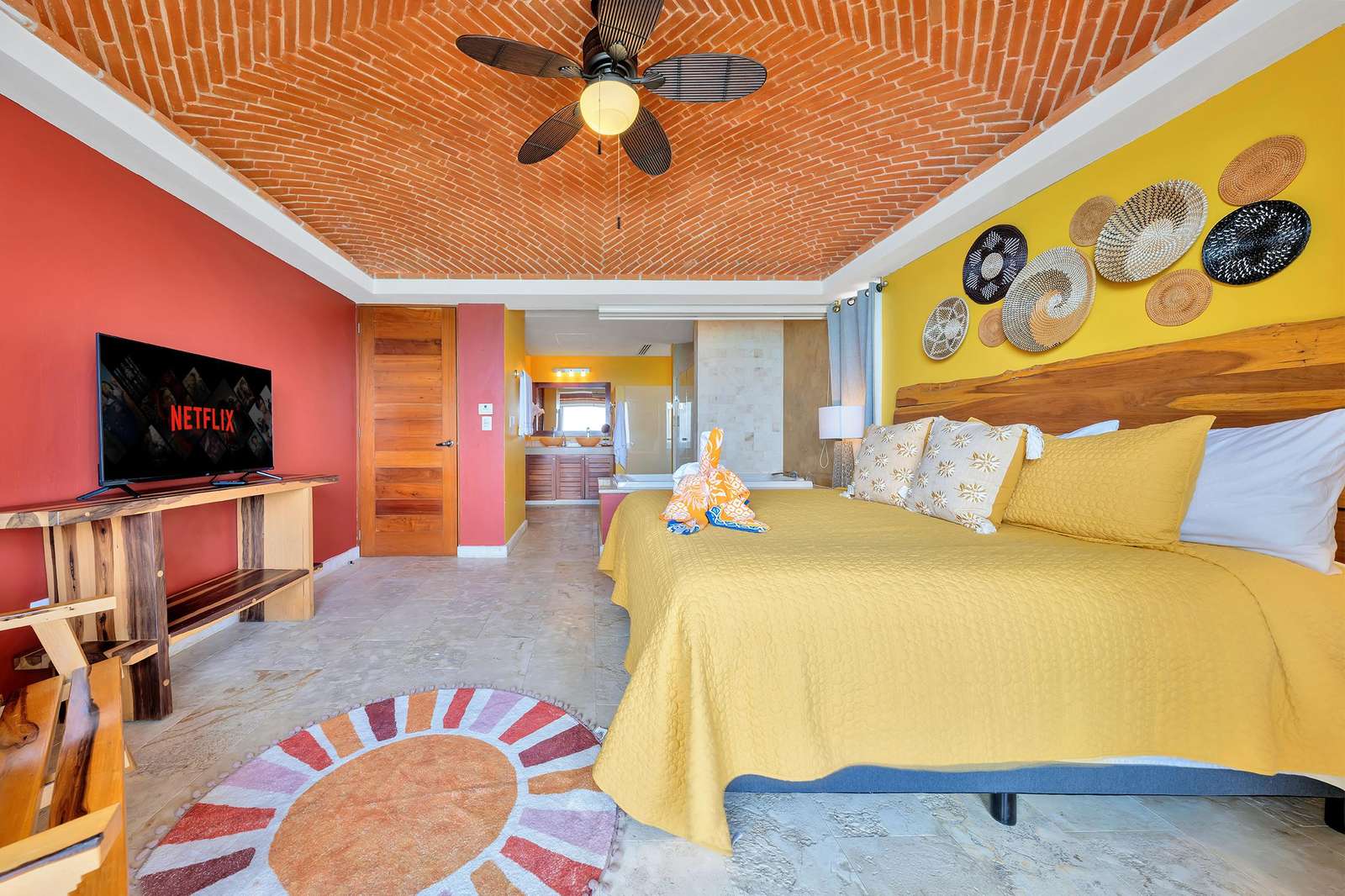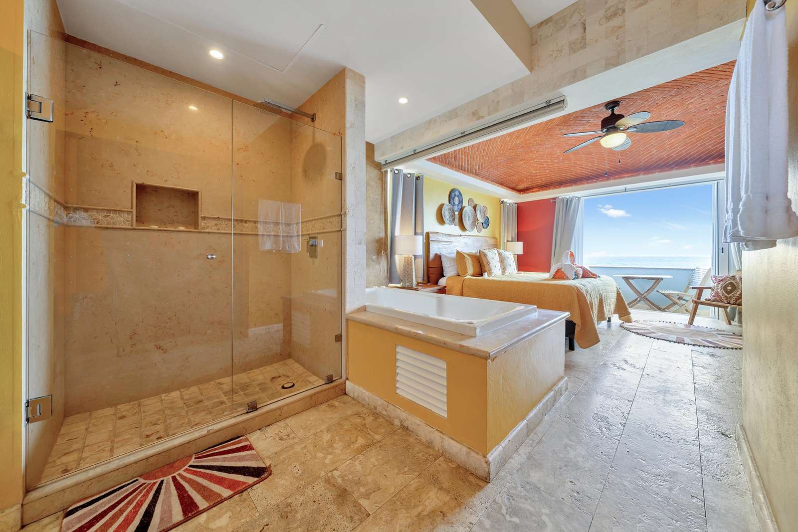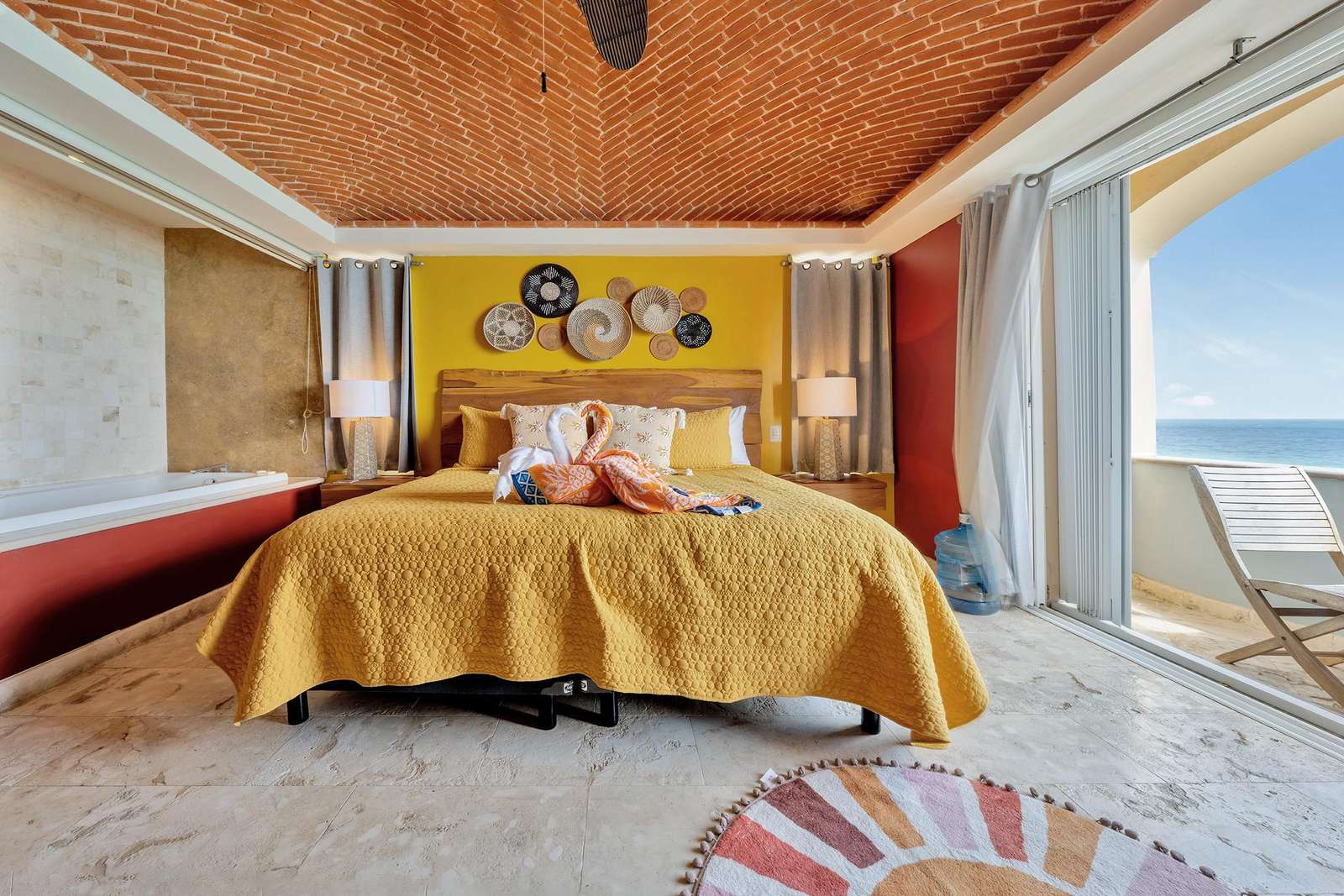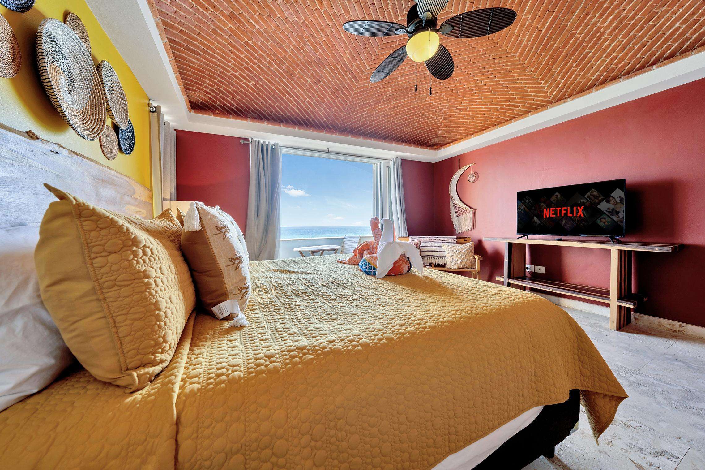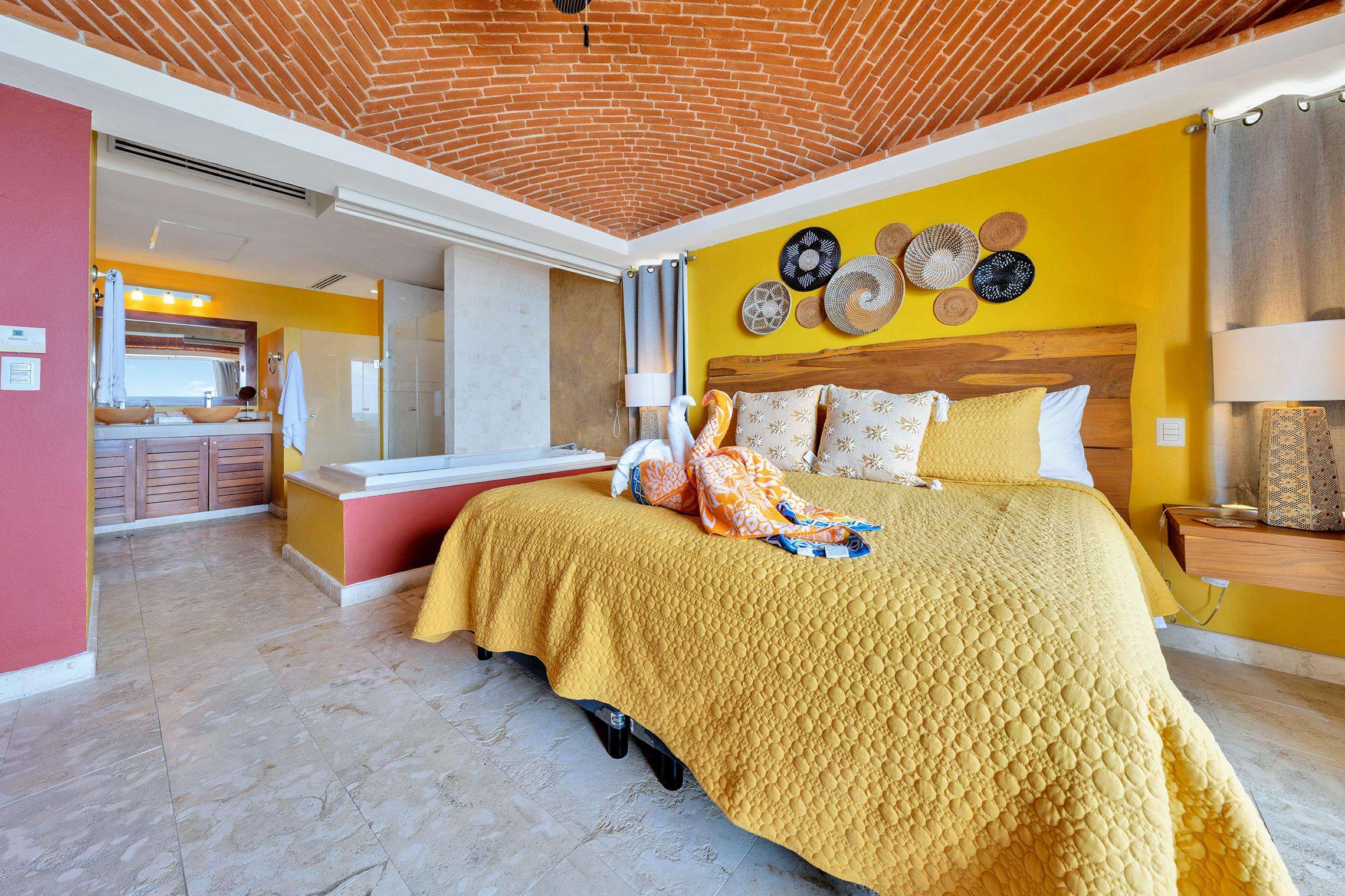 La suite cuenta con dos dormitorios, dos baños completos, sala de estar y comedor, y cocina completa. La sala de estar y el comedor dan al mar e incluyen un balcón con unas vistas sin igual del océano y del lado este de la isla. Las grandes puertas corredizas del balcón se abren completamente para ofrecer una experiencia al aire libre tanto en la sala de estar como en el dormitorio principal. El magnífico dormitorio principal cuenta con un techo abovedado de ladrillo hecho a mano e incluye un baño privado con una tina de hidromasaje de tamaño completo, una regadera a ras de piso y un tocador con lavabos de cobre para él y para ella. La habitación también está equipada con un colchón de espuma viscoelástica tamaño king, un gran televisor montado en la pared y un amplio espacio de guardarropa.