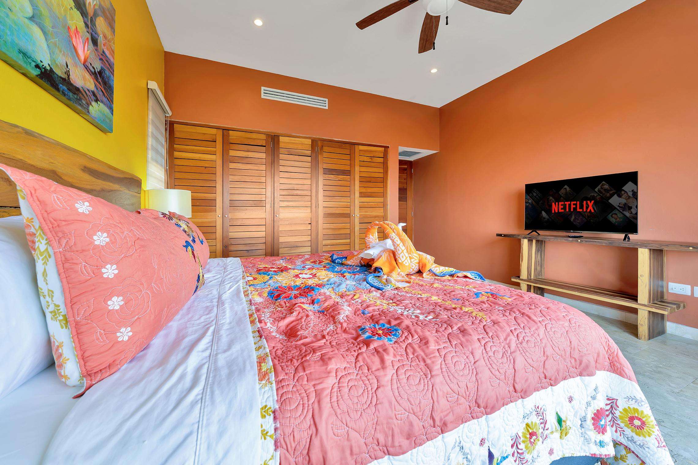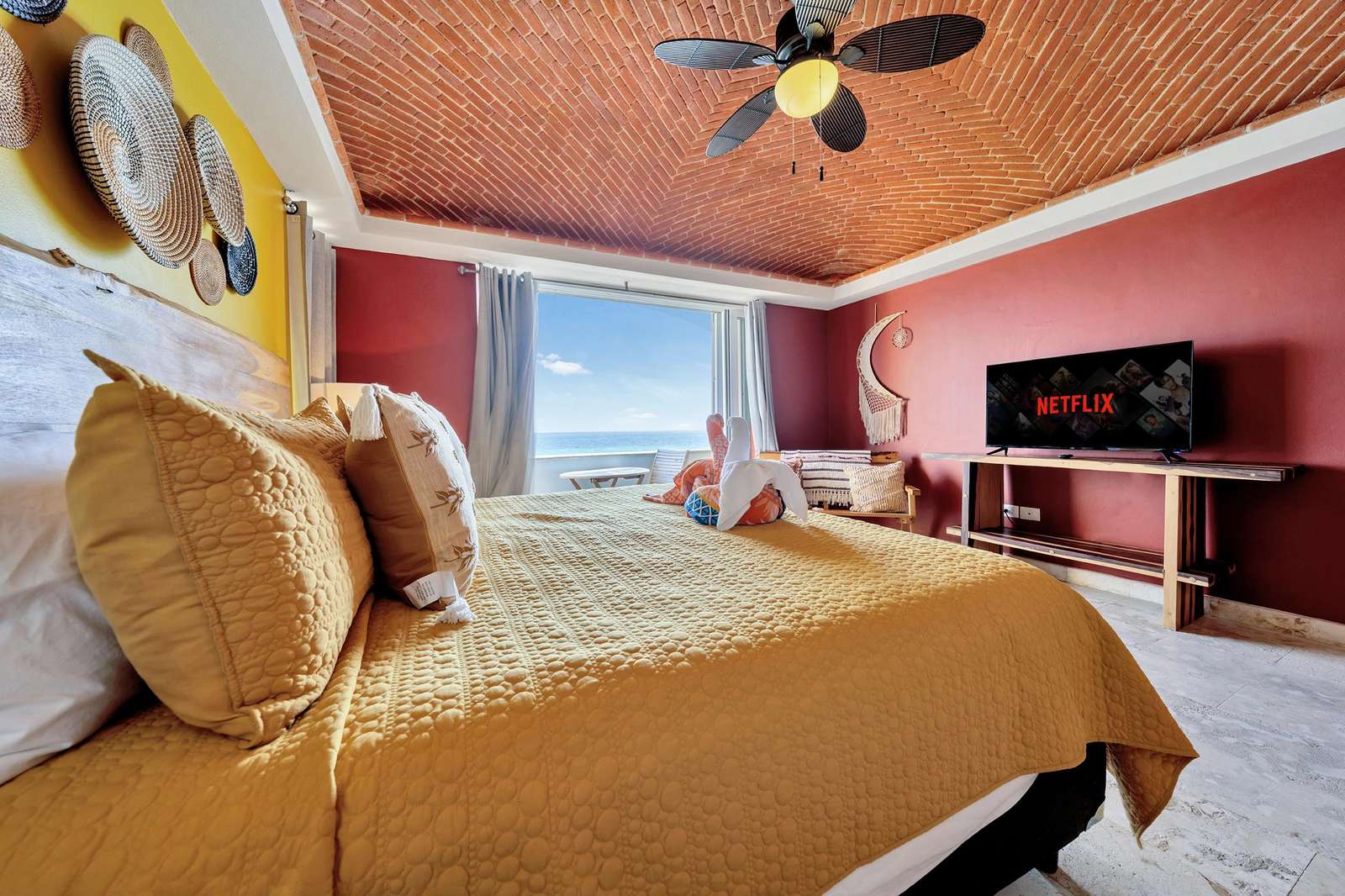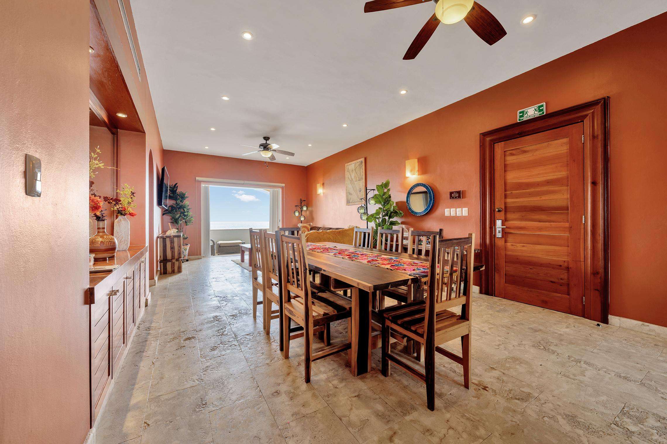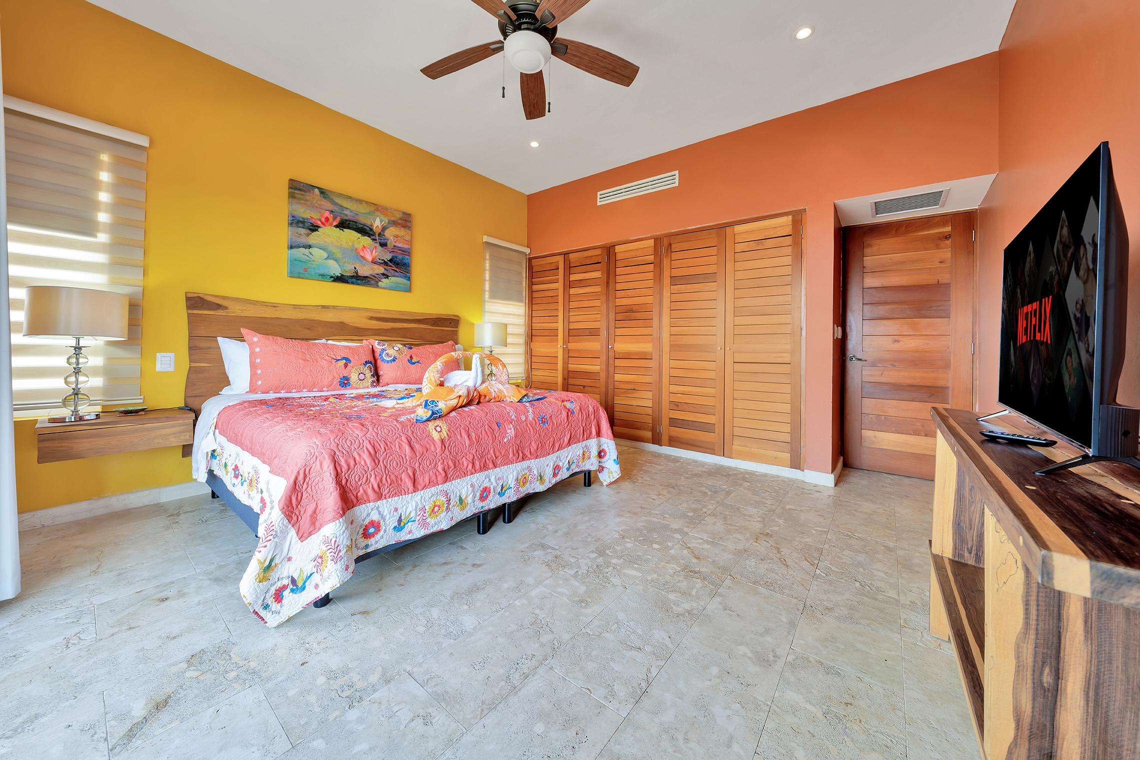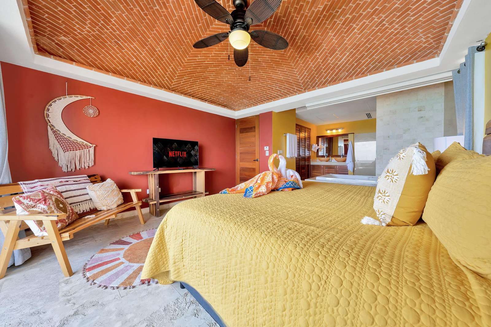 La suite cuenta con dos dormitorios, dos baños completos, sala de estar y comedor, y cocina completa. La sala de estar y el comedor dan al mar e incluyen un balcón con unas vistas sin igual del océano y del lado este de la isla. Las grandes puertas corredizas del balcón se abren completamente para ofrecer una experiencia al aire libre tanto en la sala de estar como en el dormitorio principal. El magnífico dormitorio principal cuenta con un techo abovedado de ladrillo hecho a mano e incluye un baño privado con una tina de hidromasaje de tamaño completo, una regadera a ras de piso y un tocador con lavabos de cobre para él y para ella. La habitación también está equipada con un colchón de espuma viscoelástica tamaño king, un gran televisor montado en la pared y un amplio espacio de guardarropa.