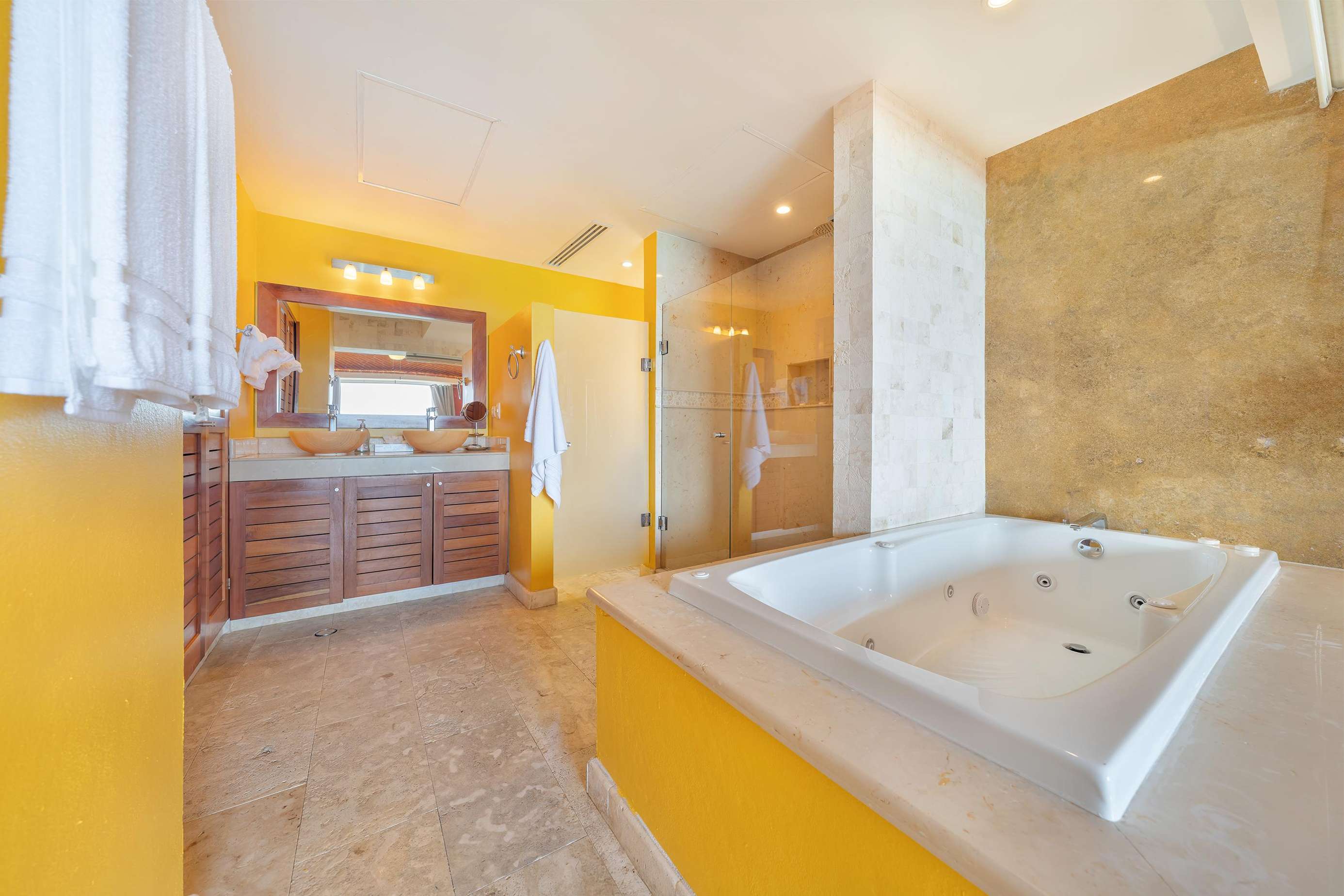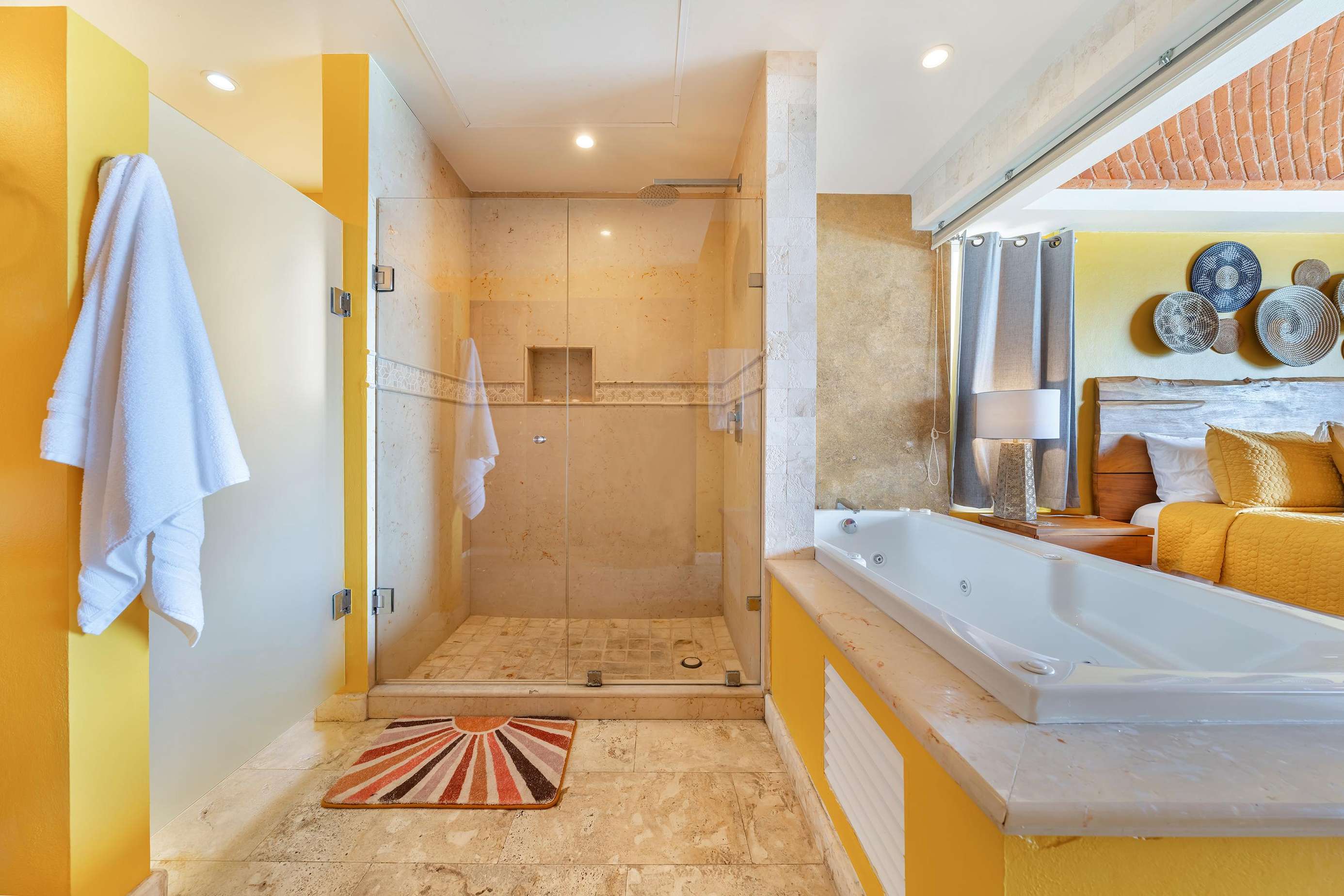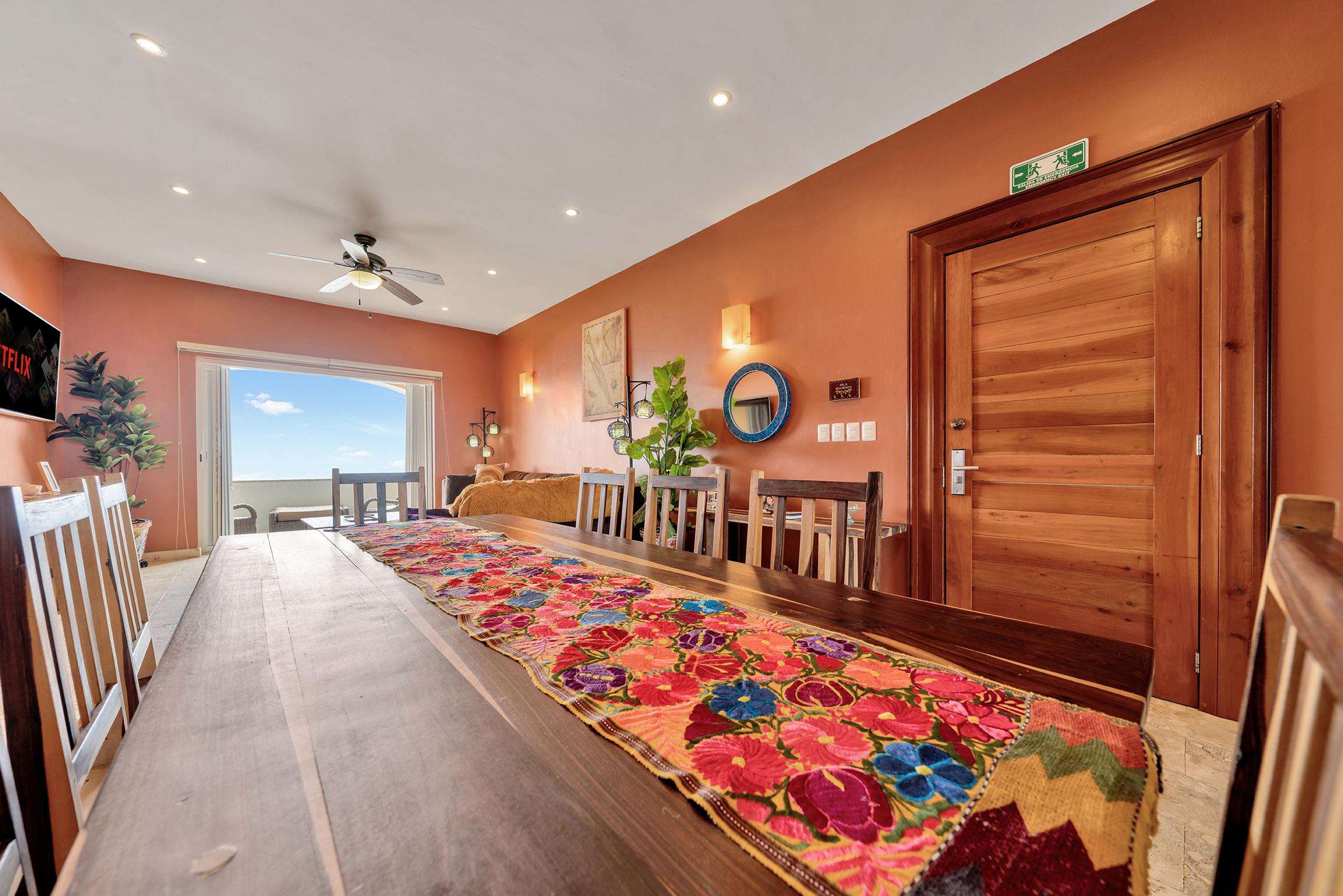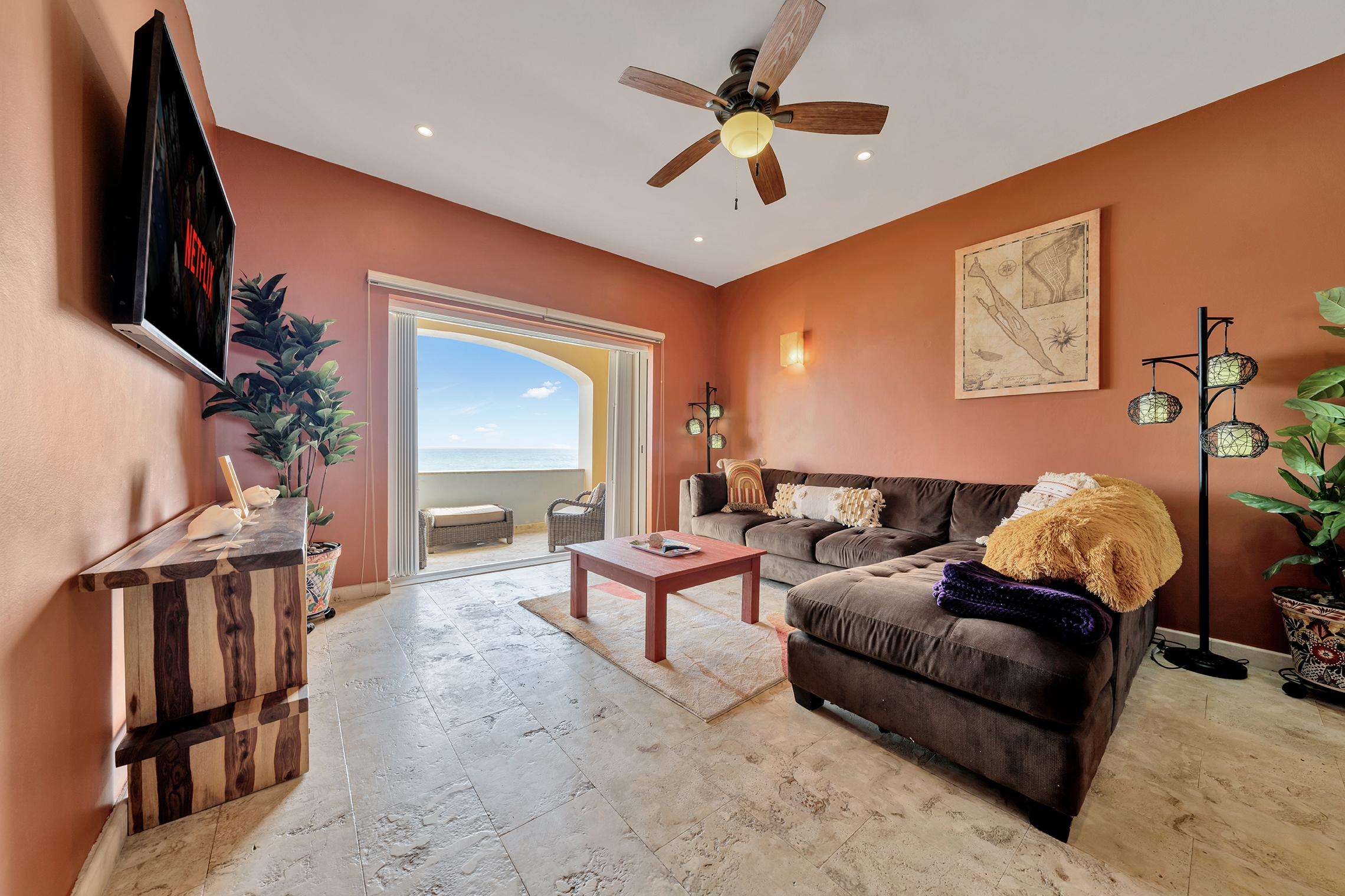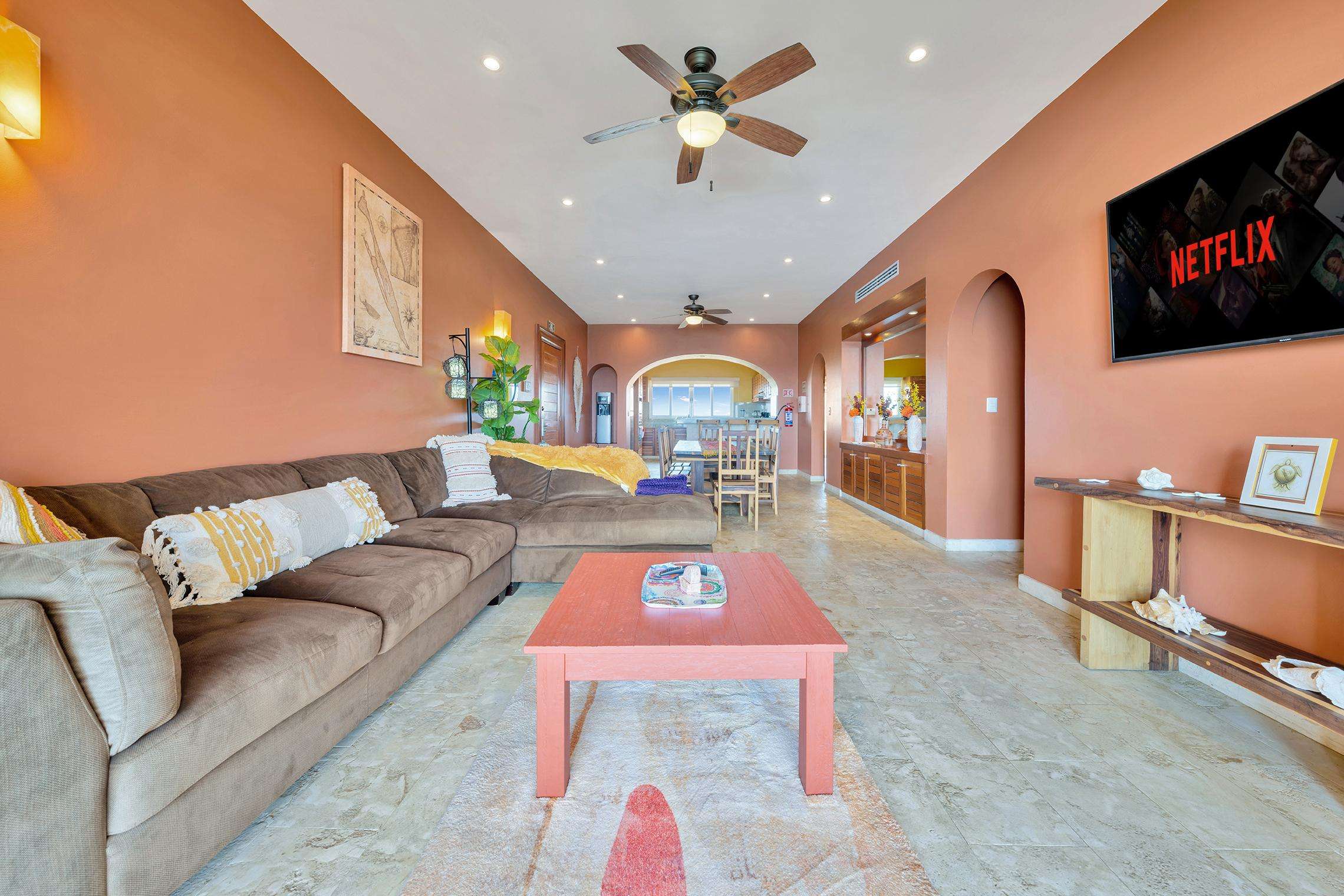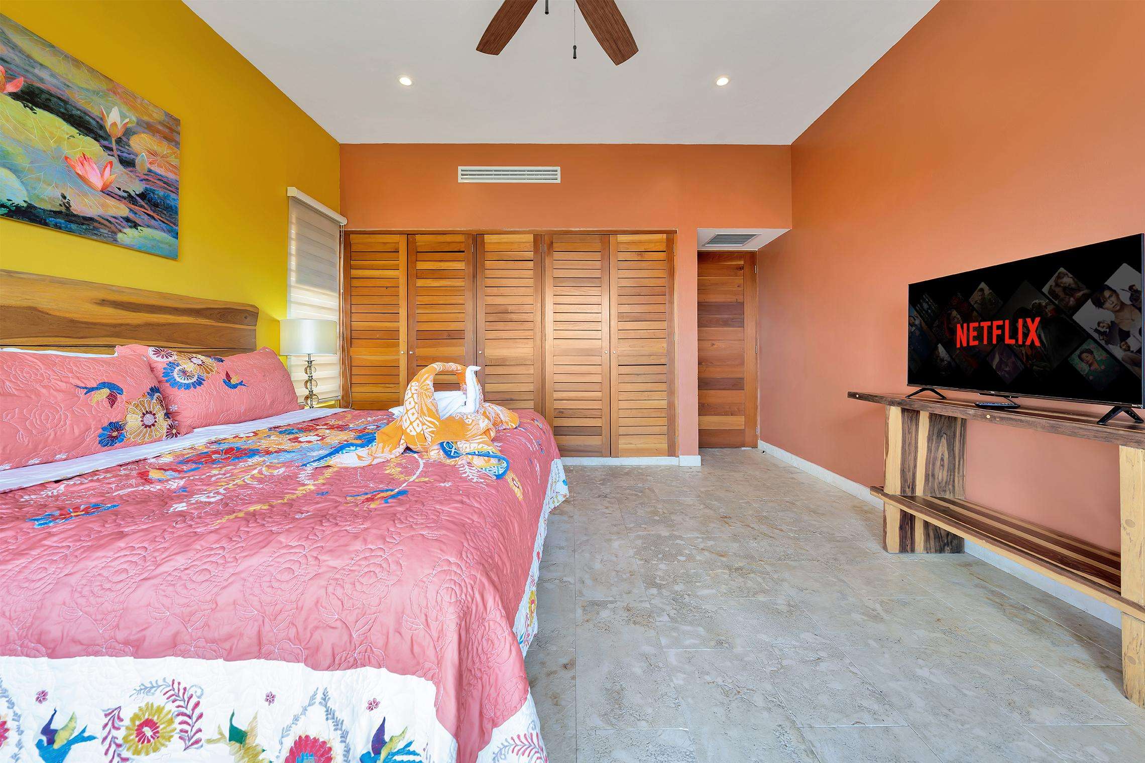 La suite cuenta con dos dormitorios, dos baños completos, sala de estar y comedor, y cocina completa. La sala de estar y el comedor dan al mar e incluyen un balcón con unas vistas sin igual del océano y del lado este de la isla. Las grandes puertas corredizas del balcón se abren completamente para ofrecer una experiencia al aire libre tanto en la sala de estar como en el dormitorio principal. El magnífico dormitorio principal cuenta con un techo abovedado de ladrillo hecho a mano e incluye un baño privado con una tina de hidromasaje de tamaño completo, una regadera a ras de piso y un tocador con lavabos de cobre para él y para ella. La habitación también está equipada con un colchón de espuma viscoelástica tamaño king, un gran televisor montado en la pared y un amplio espacio de guardarropa.