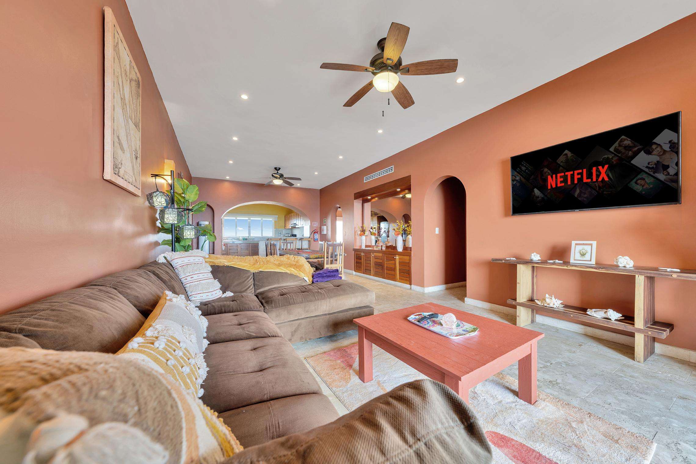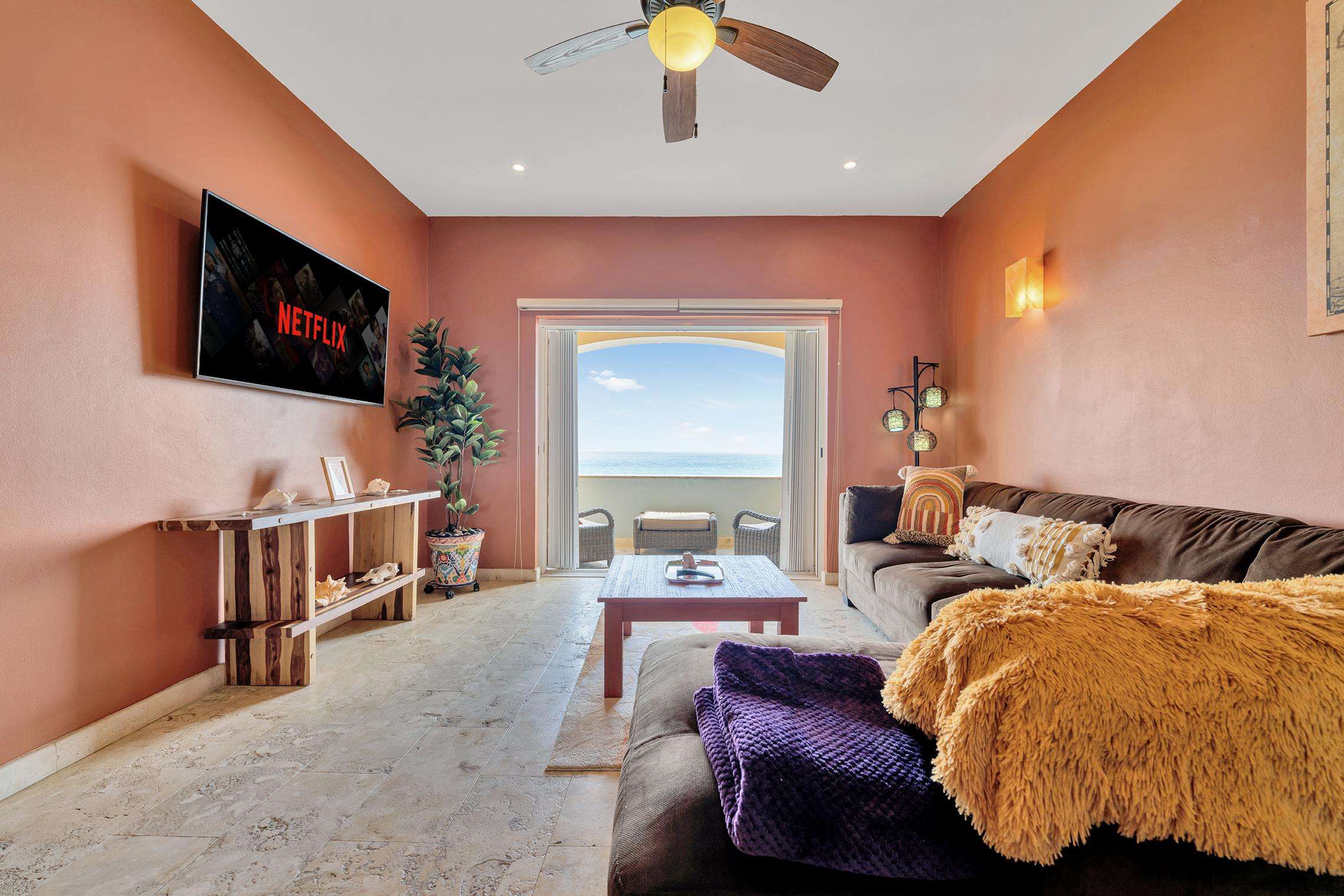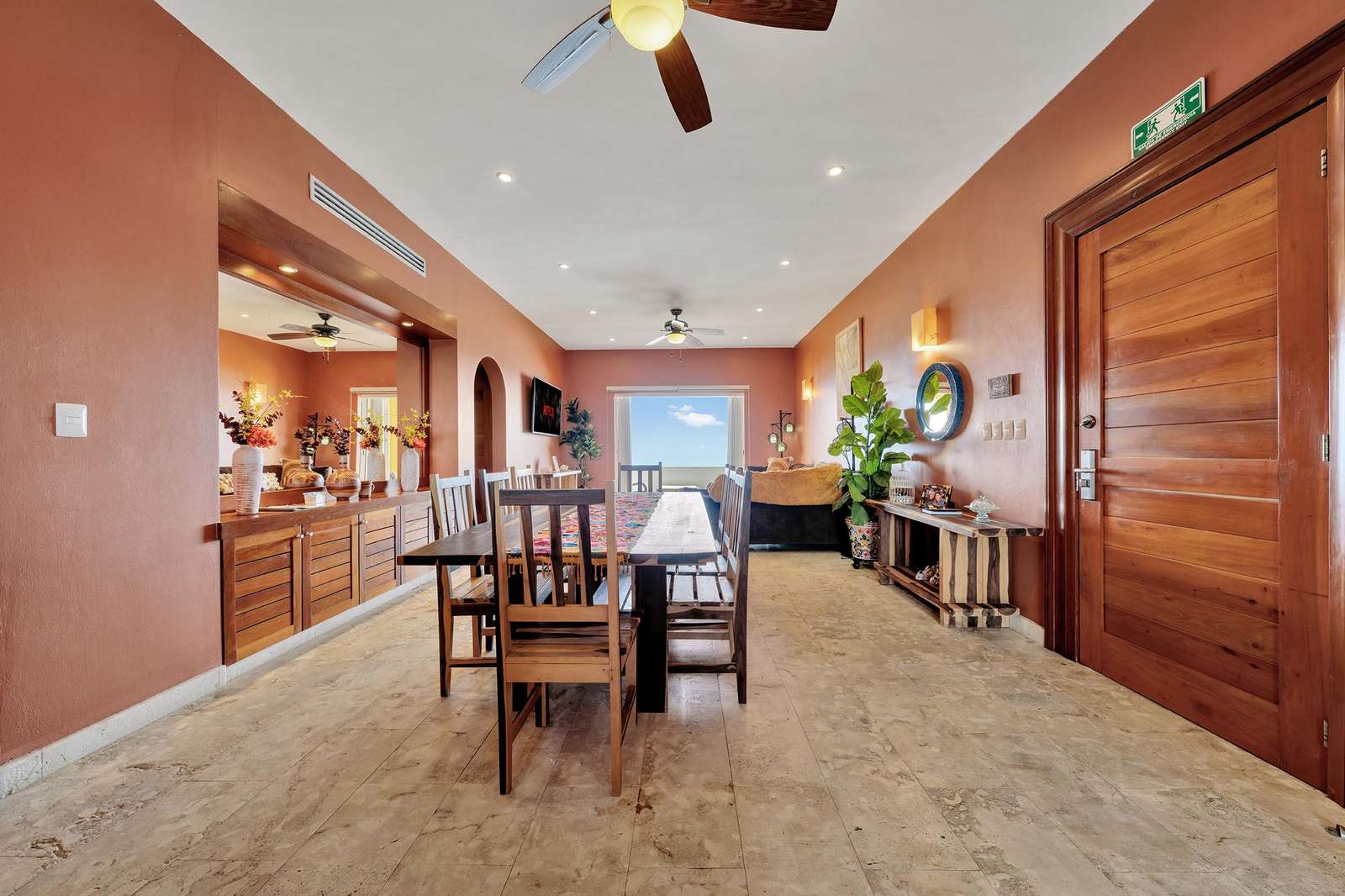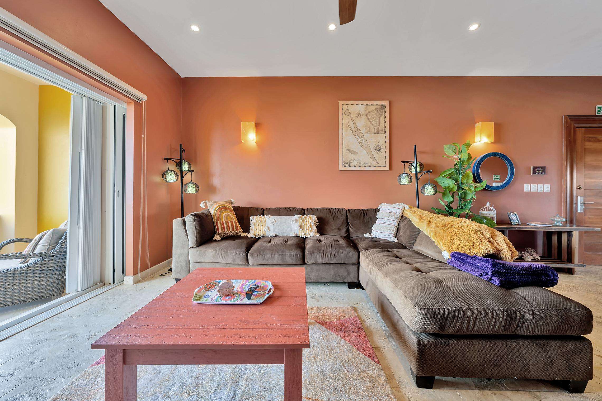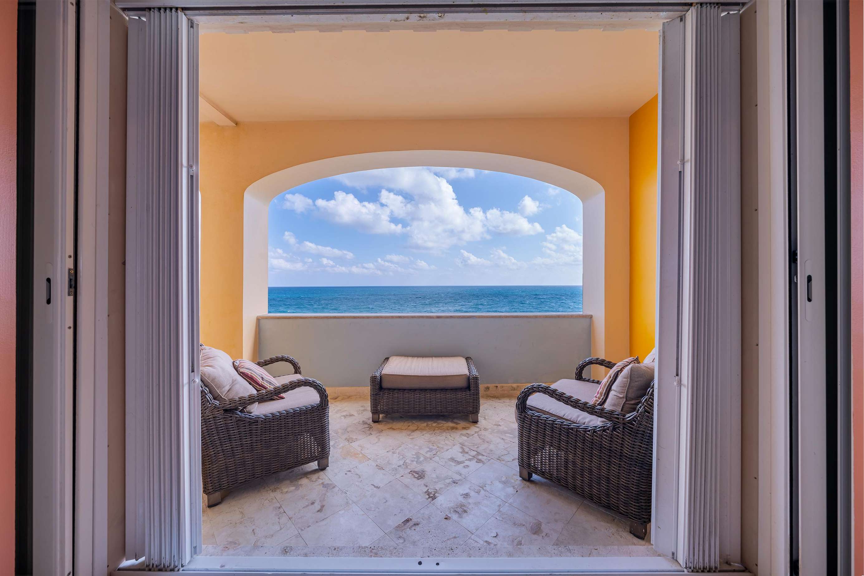 La suite cuenta con dos dormitorios, dos baños completos, sala de estar y comedor, y cocina completa. La sala de estar y el comedor dan al mar e incluyen un balcón con unas vistas sin igual del océano y del lado este de la isla. Las grandes puertas corredizas del balcón se abren completamente para ofrecer una experiencia al aire libre tanto en la sala de estar como en el dormitorio principal. El magnífico dormitorio principal cuenta con un techo abovedado de ladrillo hecho a mano e incluye un baño privado con una tina de hidromasaje de tamaño completo, una regadera a ras de piso y un tocador con lavabos de cobre para él y para ella. La habitación también está equipada con un colchón de espuma viscoelástica tamaño king, un gran televisor montado en la pared y un amplio espacio de guardarropa.