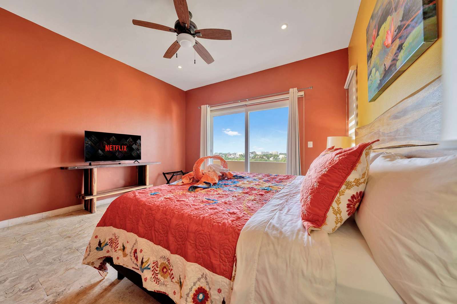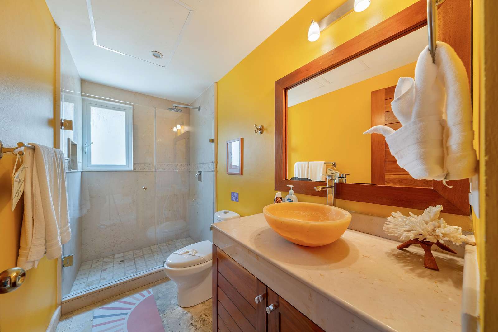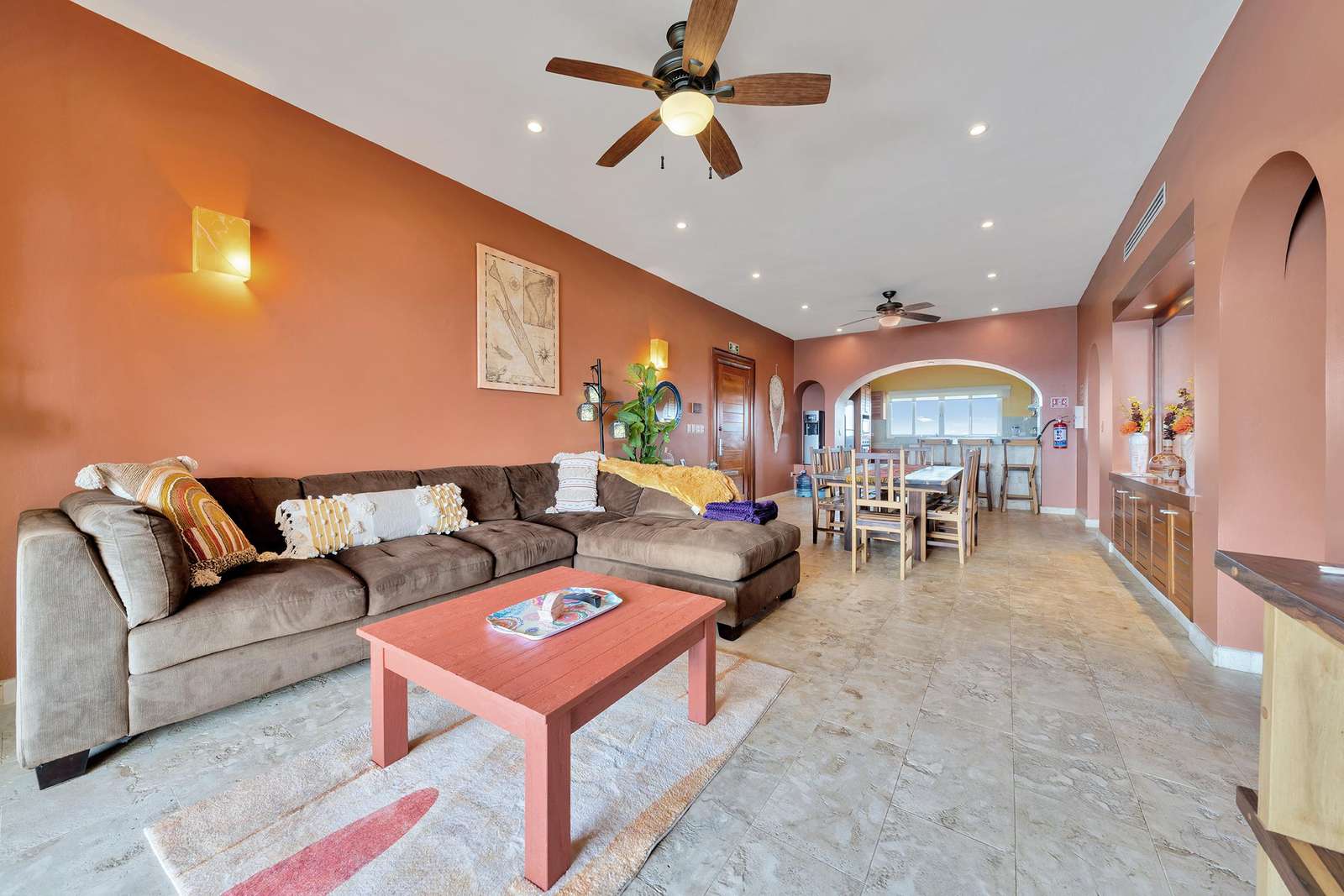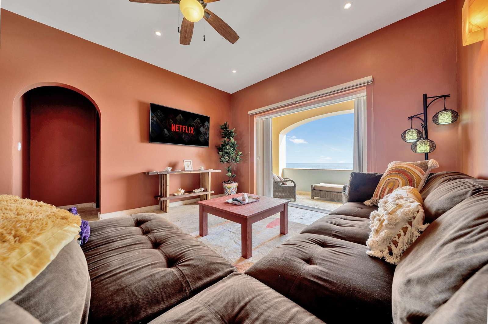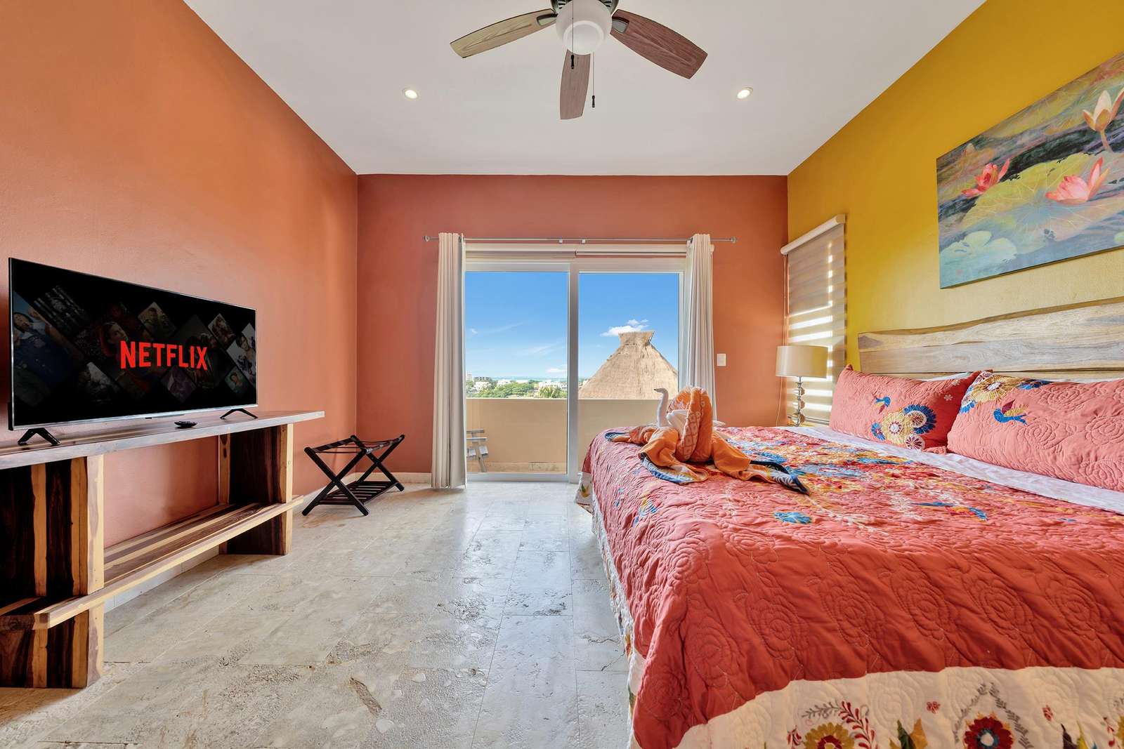 La suite cuenta con dos dormitorios, dos baños completos, sala de estar y comedor, y cocina completa. La sala de estar y el comedor dan al mar e incluyen un balcón con unas vistas sin igual del océano y del lado este de la isla. Las grandes puertas corredizas del balcón se abren completamente para ofrecer una experiencia al aire libre tanto en la sala de estar como en el dormitorio principal. El magnífico dormitorio principal cuenta con un techo abovedado de ladrillo hecho a mano e incluye un baño privado con una tina de hidromasaje de tamaño completo, una regadera a ras de piso y un tocador con lavabos de cobre para él y para ella. La habitación también está equipada con un colchón de espuma viscoelástica tamaño king, un gran televisor montado en la pared y un amplio espacio de guardarropa.