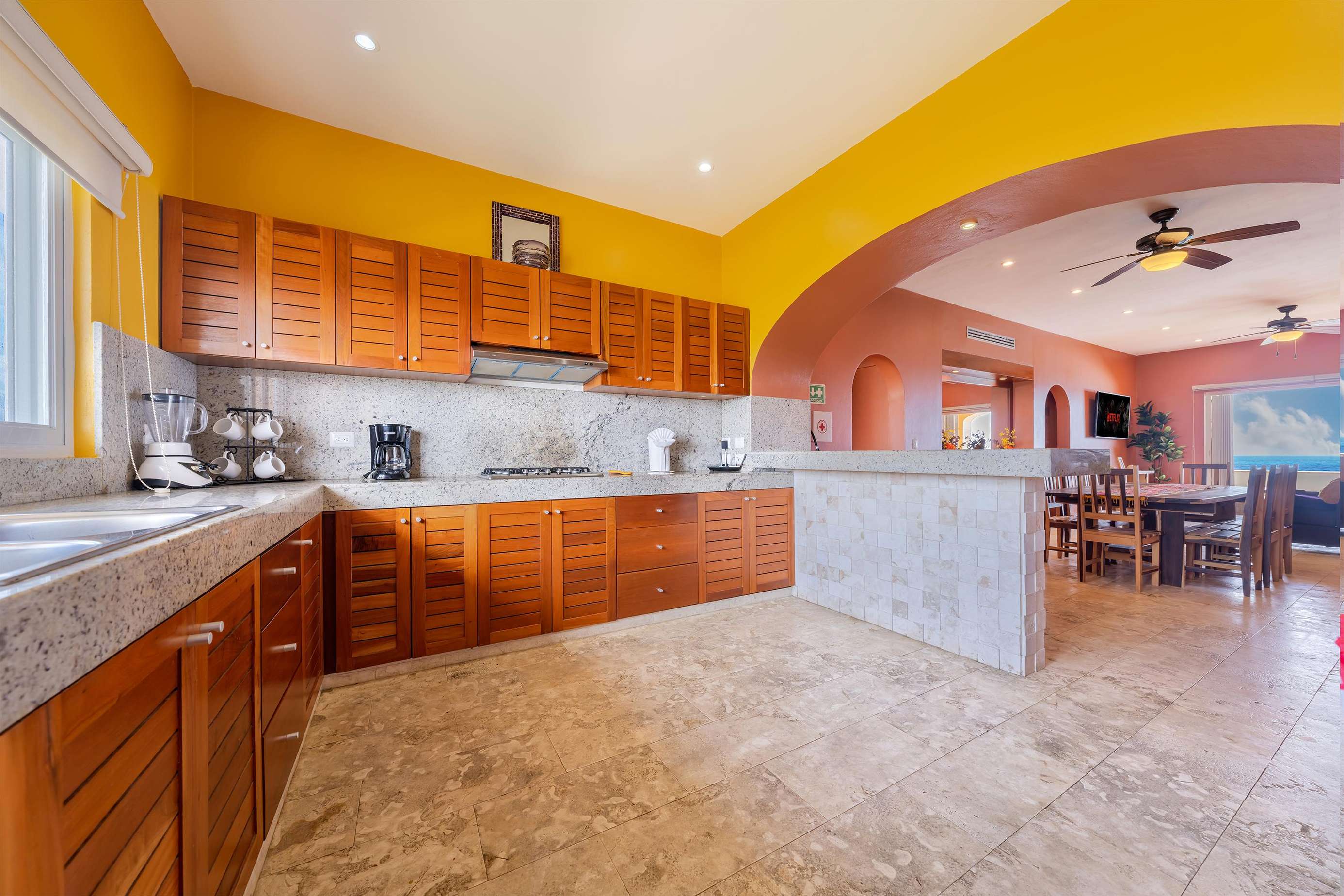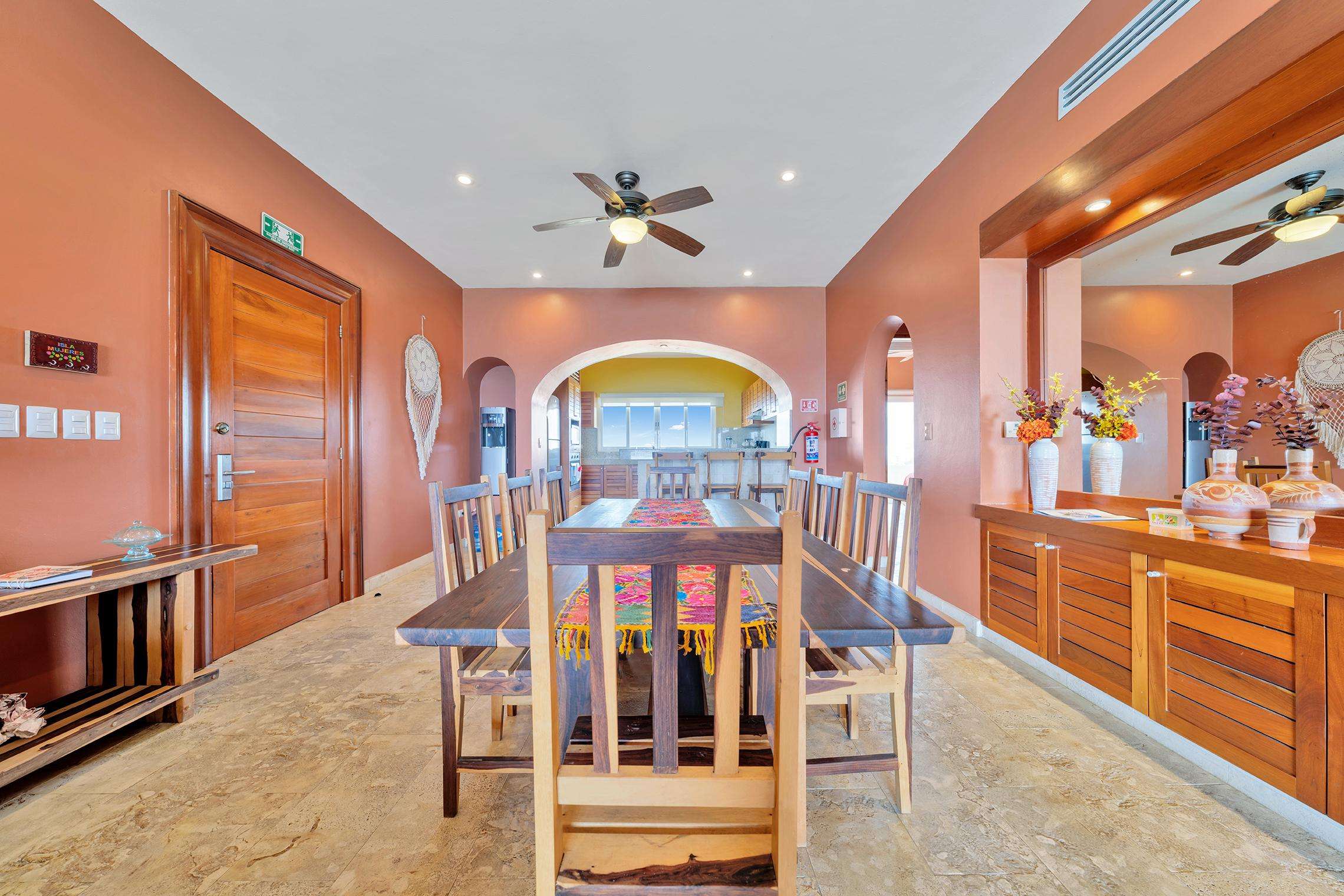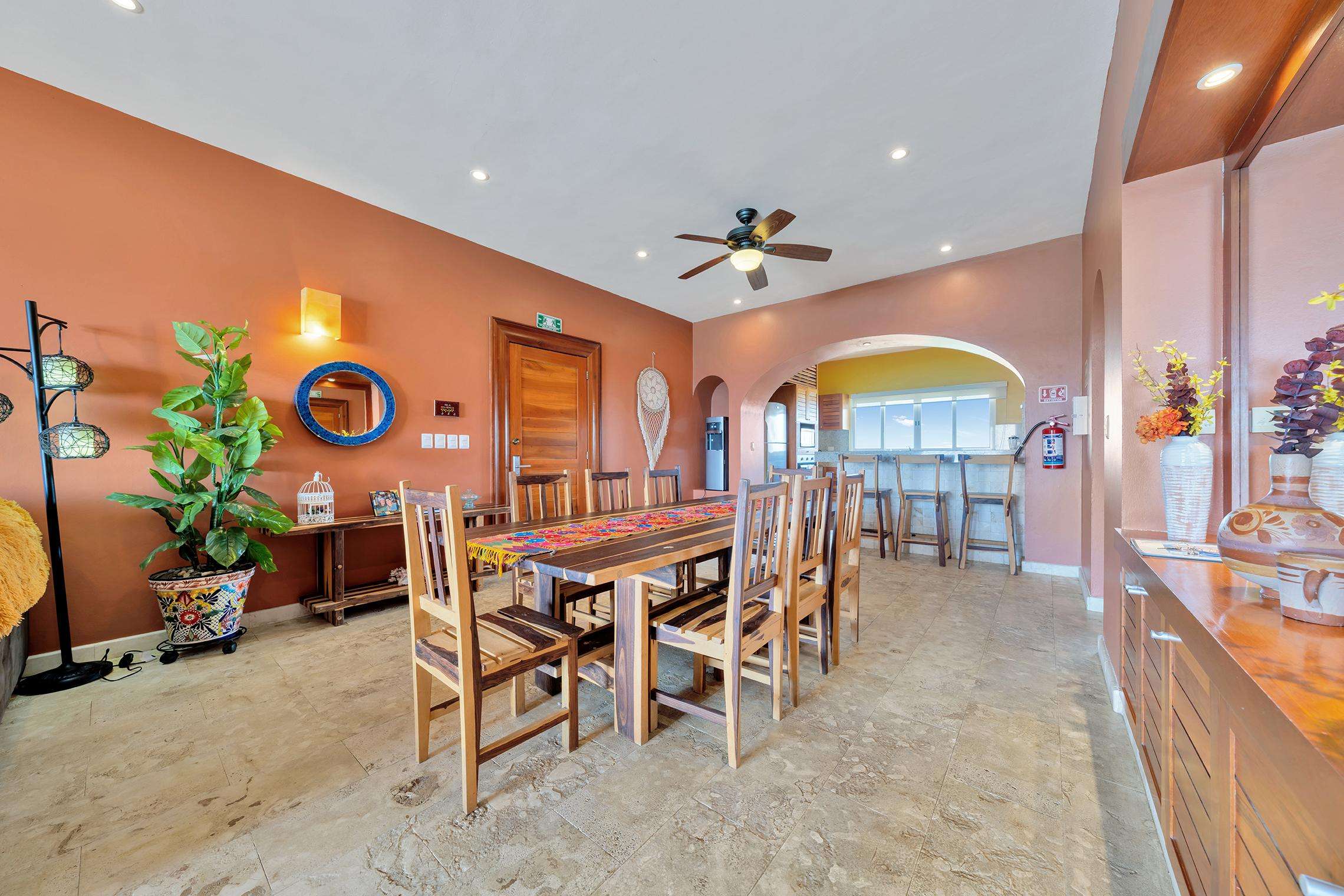 La cocina da al lado oeste de Isla 33 y permite ver todo el paisaje de Isla Mujeres y las luces nocturnas del horizonte de Cancún. La cocina cuenta con un fregadero mexicano de cobre martillado a mano y está totalmente equipada con estufa y horno de gas, refrigerador de tamaño completo, lavavajillas y microondas. También hay una cafetera y un juego completo de ollas y platos de calidad gourmet para que le resulte fácil preparar comidas completas en casa. Puede elegir entre comer en la barra de desayuno o cenar cómodamente en la gran mesa del comedor formal.