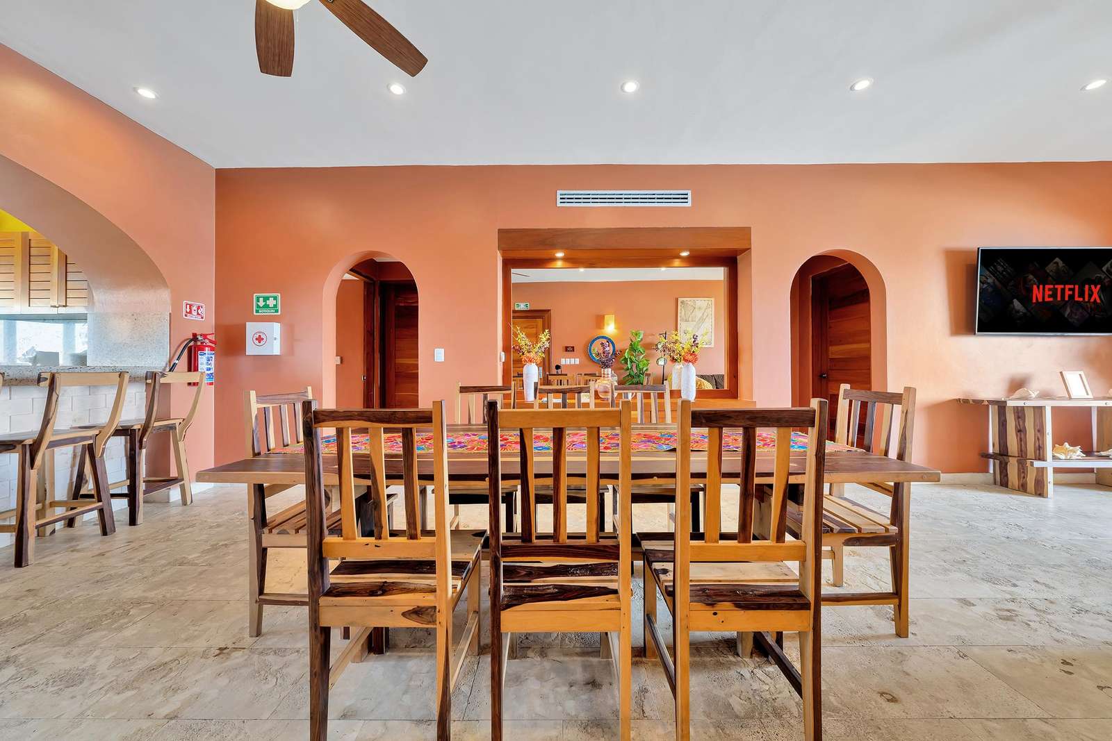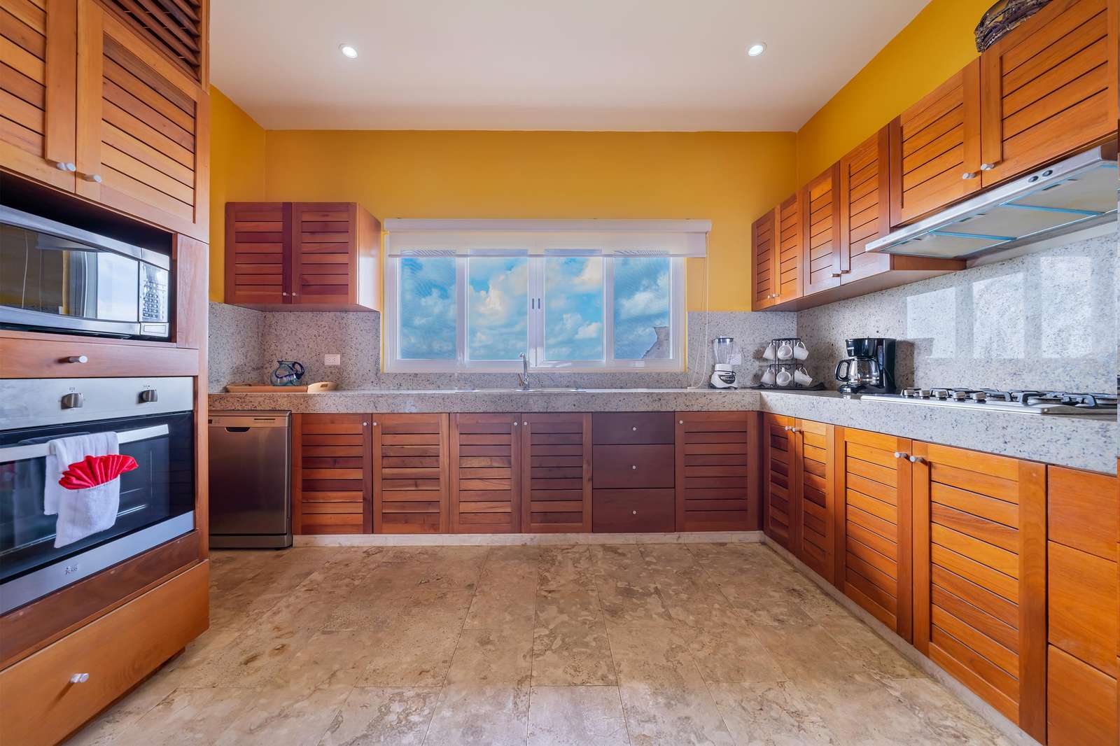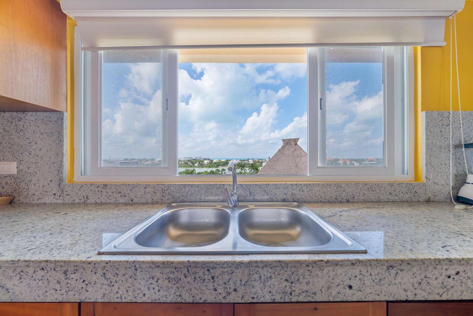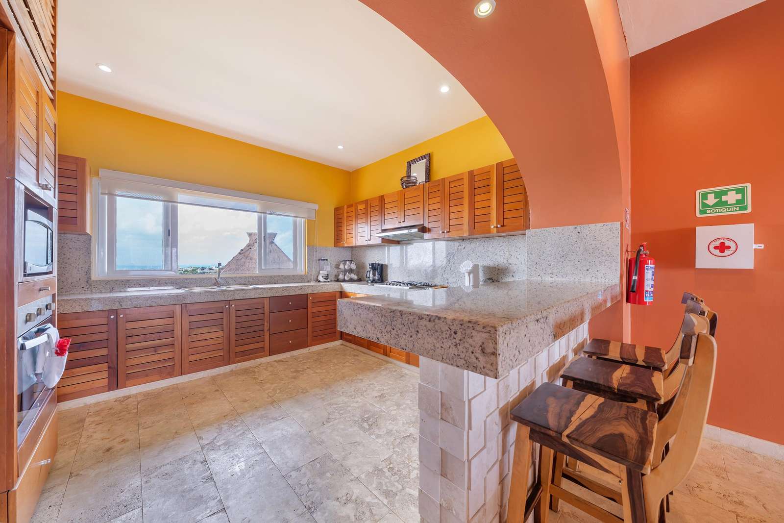 La cocina da al lado oeste de Isla 33 y permite ver todo el paisaje de Isla Mujeres y las luces nocturnas del horizonte de Cancún. La cocina cuenta con un fregadero mexicano de cobre martillado a mano y está totalmente equipada con estufa y horno de gas, refrigerador de tamaño completo, lavavajillas y microondas. También hay una cafetera y un juego completo de ollas y platos de calidad gourmet para que le resulte fácil preparar comidas completas en casa. Puede elegir entre comer en la barra de desayuno o cenar cómodamente en la gran mesa del comedor formal.