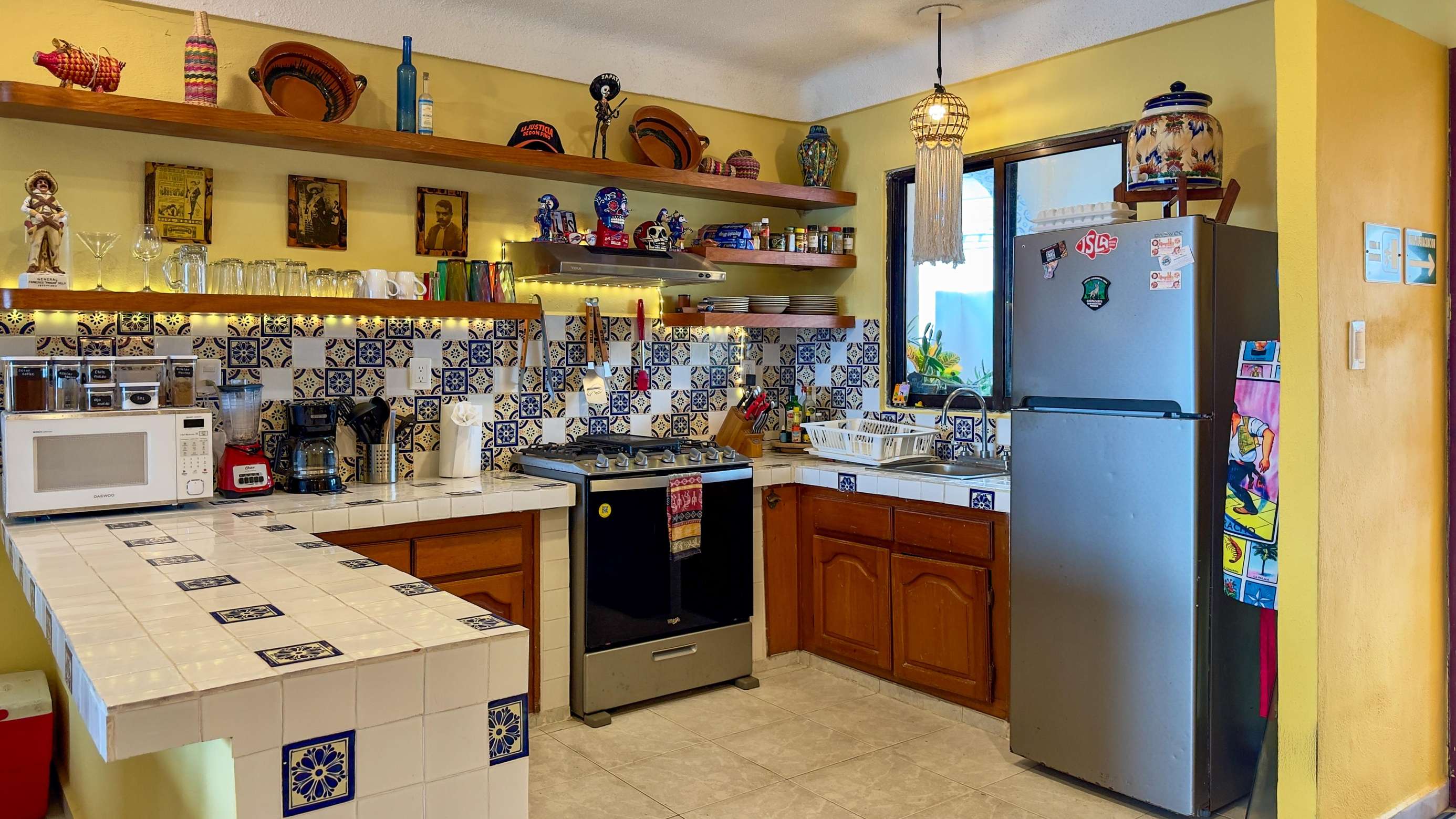 La cocina completa incluye refrigerador grande, horno, estufa, microondas, vajilla, ollas y sartenes, utensilios y cubiertos: ¡todo lo necesario para preparar deliciosas comidas familiares!