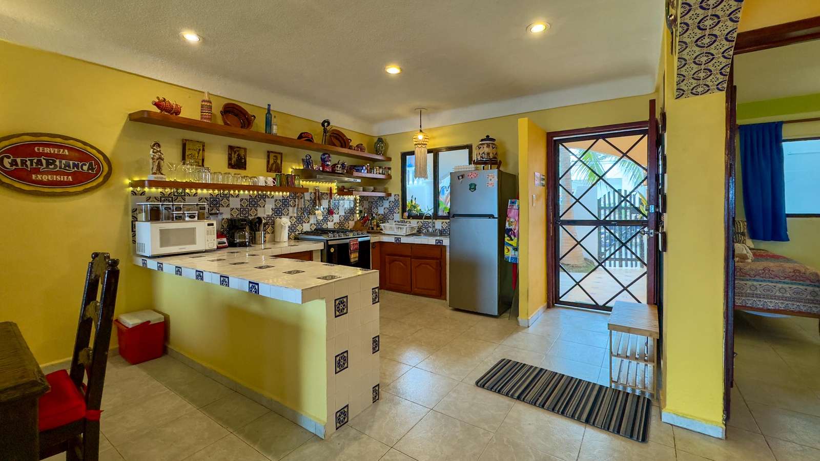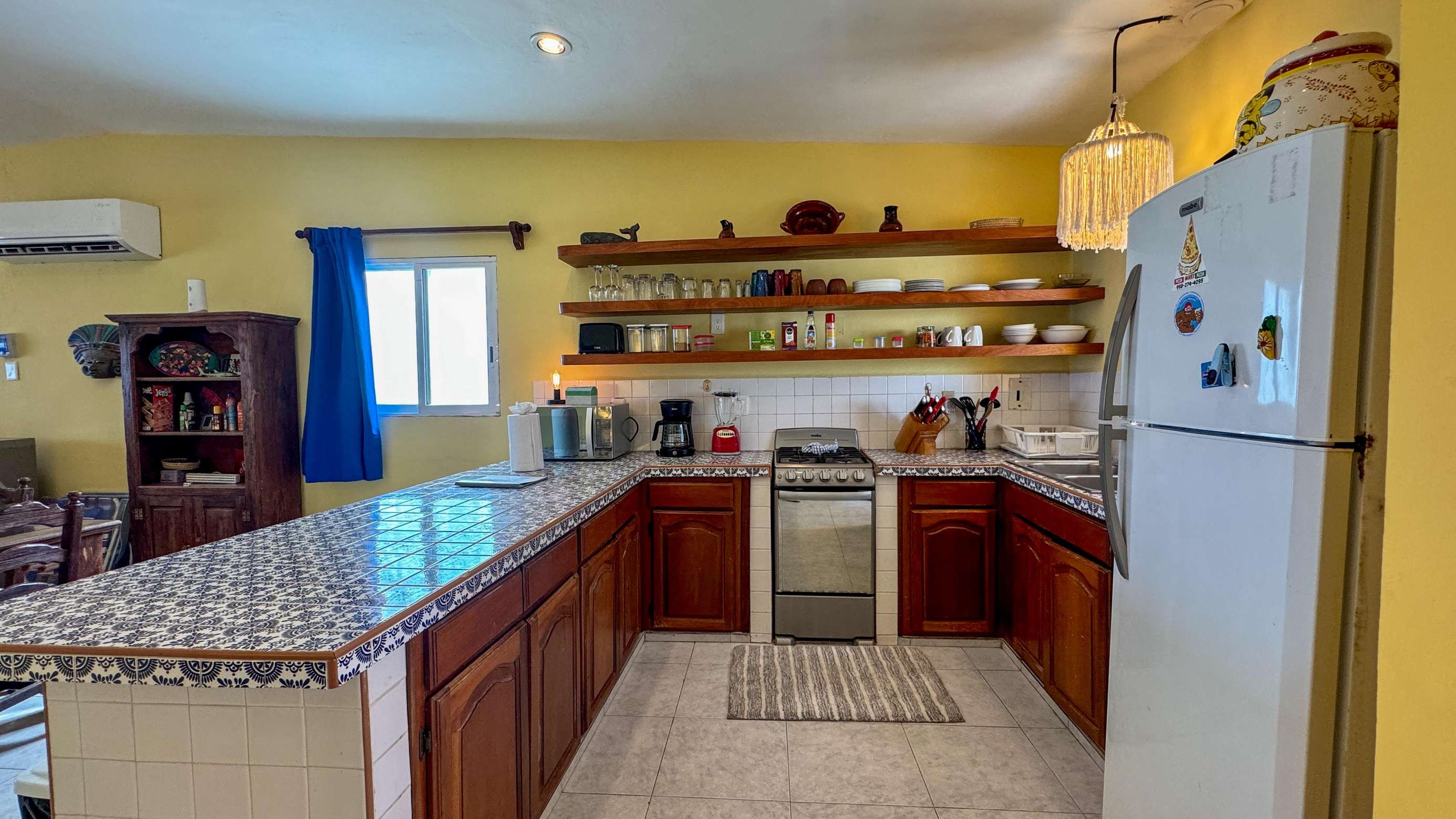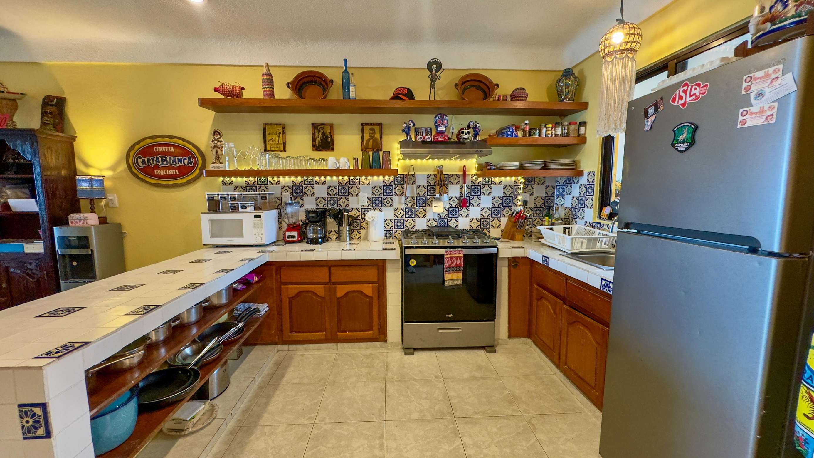 La cocina completa incluye refrigerador grande, horno, estufa, microondas, vajilla, ollas y sartenes, utensilios y cubiertos: ¡todo lo necesario para preparar deliciosas comidas familiares!