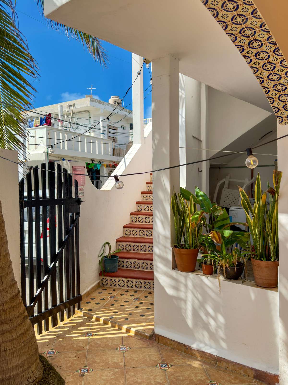Casa de vacaciones luminosa y espaciosa con amplios balcones y palmeras.
