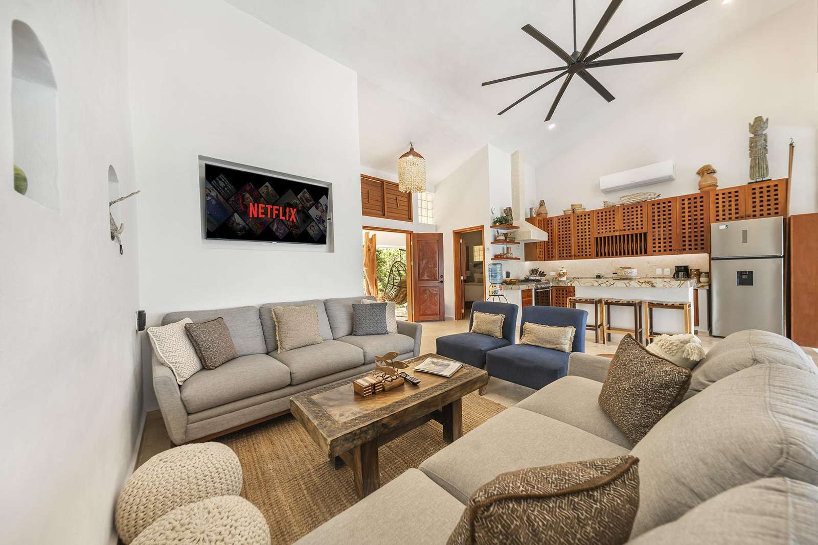 La amplia sala de estar de concepto abierto y la cocina gourmet se encuentran a solo unos pasos de la nueva piscina y las terrazas cubiertas. Una pared de puertas corredizas de vidrio apilables une el interior con el exterior, permitiendo que las vistas y la brisa marina entren en la casa. La terraza de la piscina incluye tumbonas para tomar el sol y dos terrazas separadas cubiertas con palapas con áreas de sala y comedor al aire libre. También se incluye una regadera exterior y un medio baño para facilitar el acceso mientras se disfruta de las áreas exteriores y una zona de barbacoa al aire libre. El amplio jardín delantero está muy bien cuidado y es perfecto para relajarse. La casa incluye acceso a Internet a través de Starlink y uso de la lavadora/secadora.