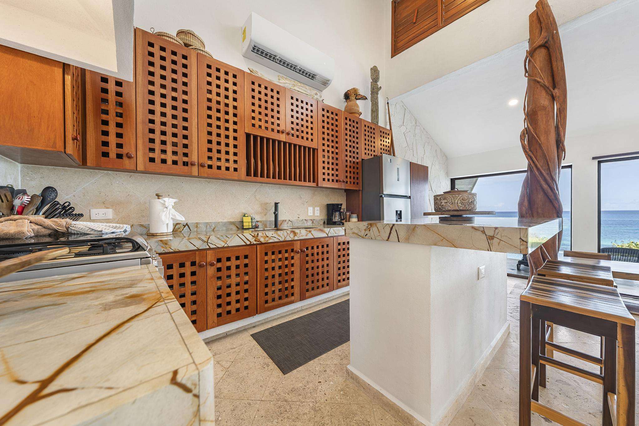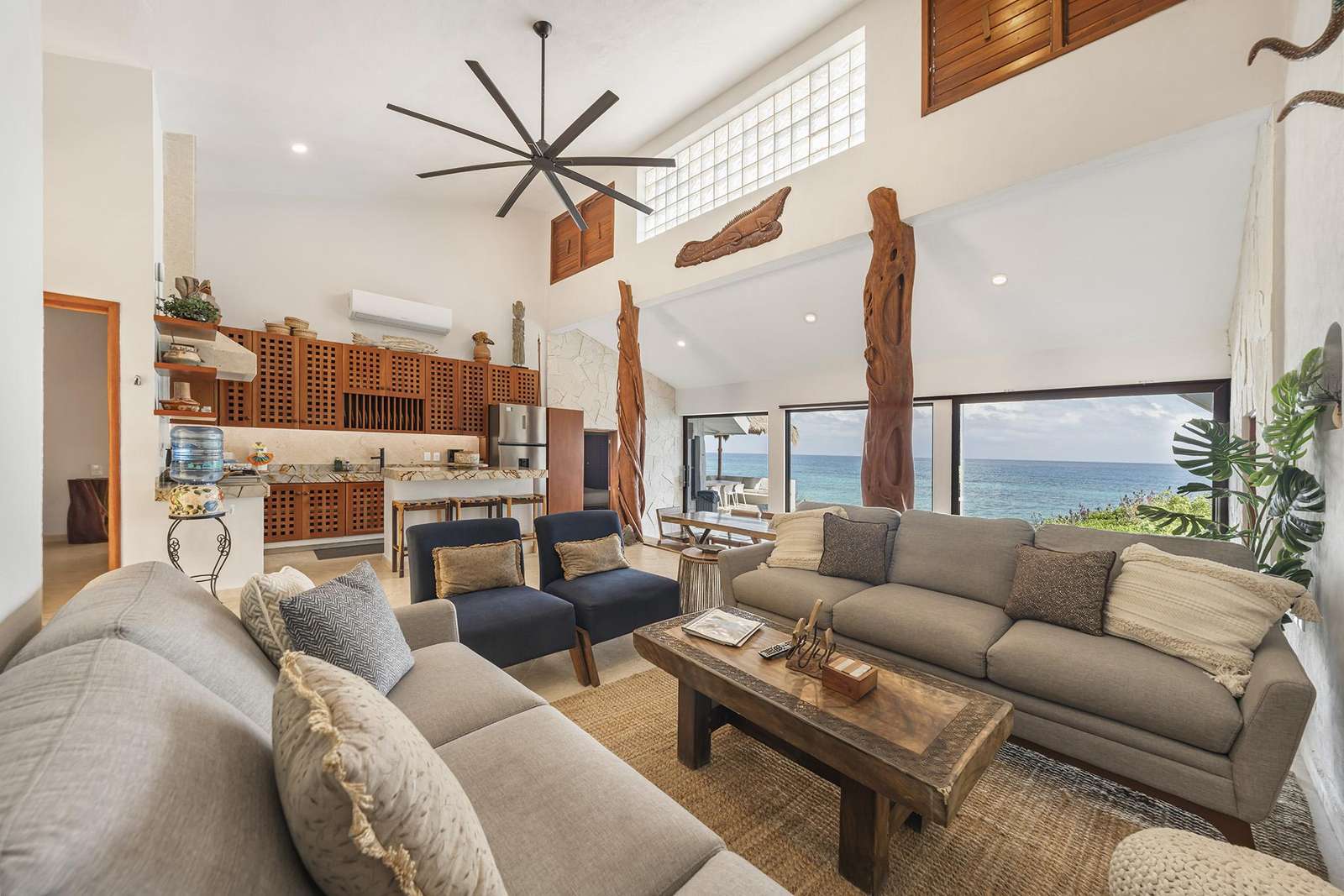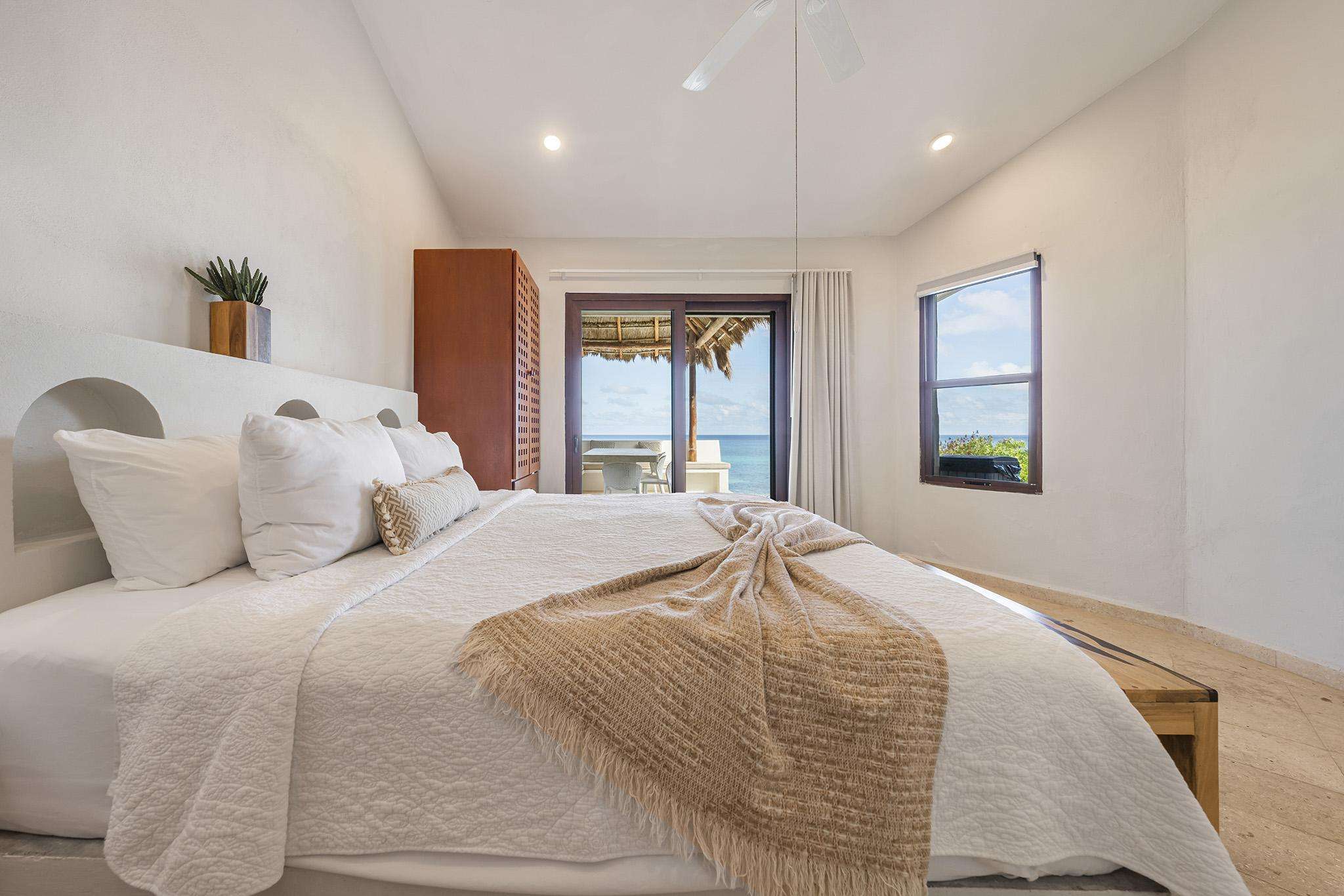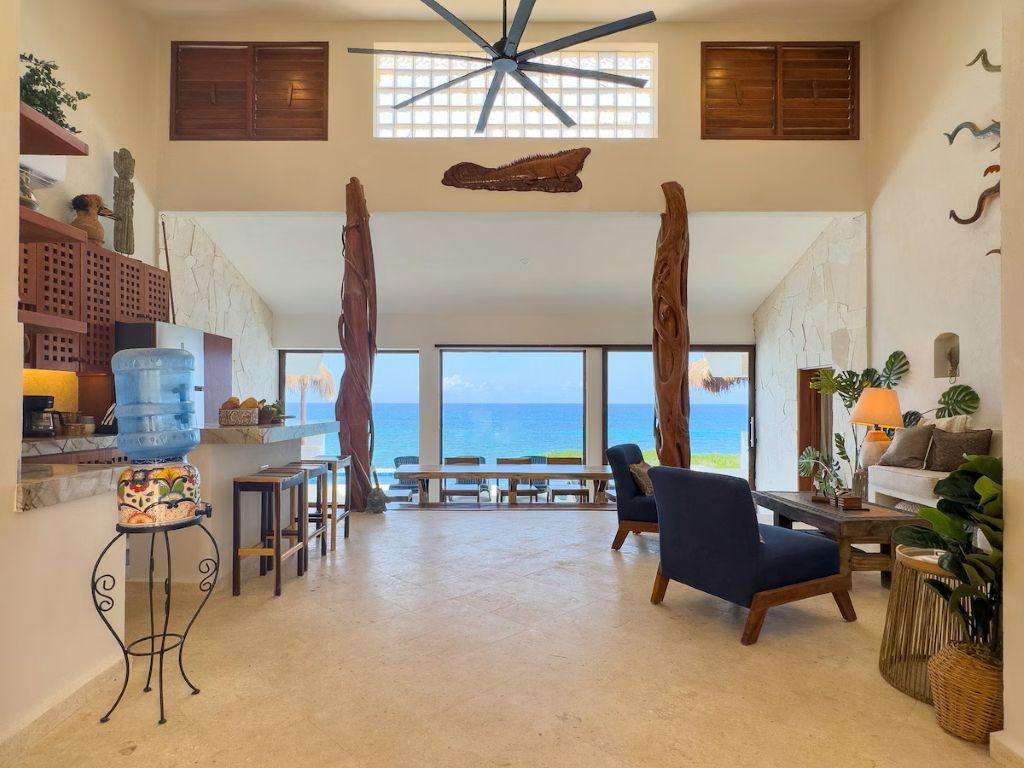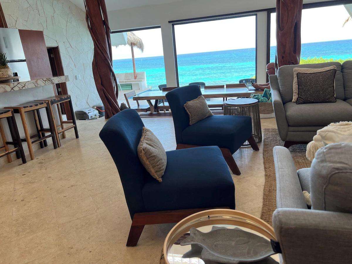 Las vistas panorámicas del Caribe, tanto desde el interior de la casa como desde la terraza de la piscina y las zonas de descanso cubiertas con palapas, le dejarán sin aliento. Nuestra casa acaba de ser completamente renovada y todas las superficies han sido sustituidas por acabados de alta gama. Cuenta con cuatro dormitorios principales, cada uno con baño privado y cama king size.