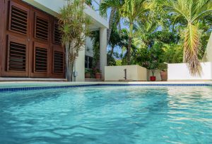 - Lush courtyard pool framed by palm trees, flowering plants, and cantera stone