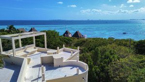 - Indoor–outdoor living—arched walkways, garden-side terraces, and an upper-level rooftop pergola with views of Cancún Bay