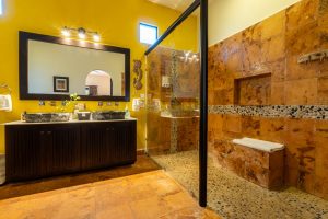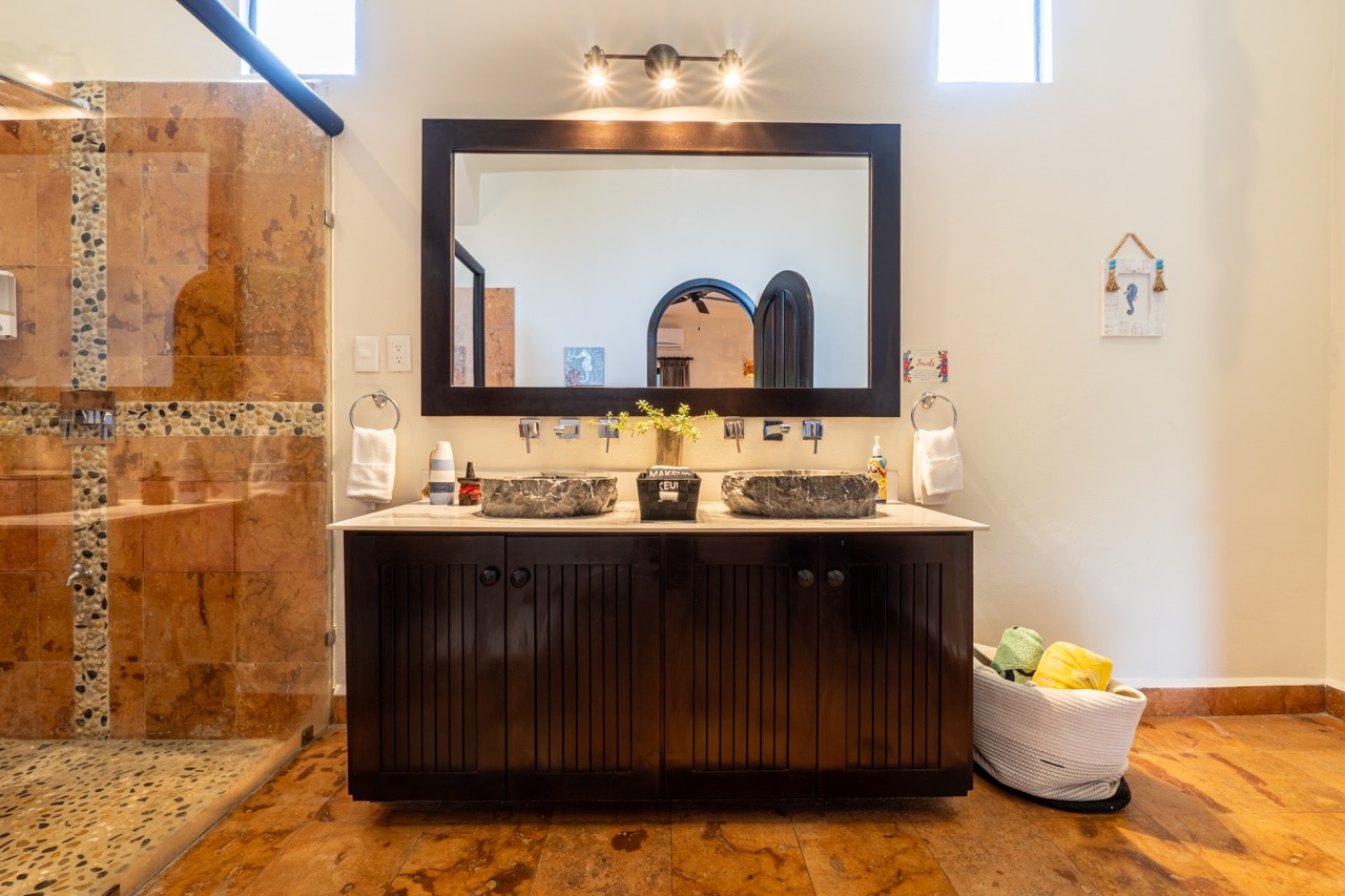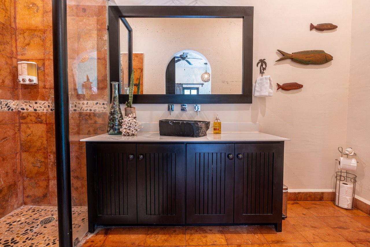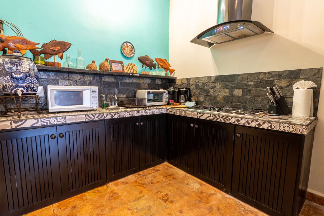 At the heart of the property is a full chef’s kitchen, ideal for hosting breakfasts, private dinners, cooking classes, or catered group events. Multiple lounging nooks, terraces, and beautifully tiled pool areas give the entire property an inviting, boutique-hotel feel.