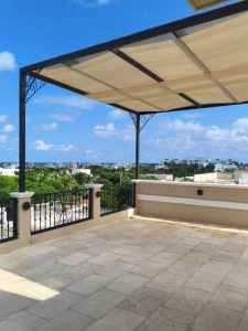 ○ Rooftop Terrace: Includes an outdoor kitchen, BBQ area (under a covered pergola),